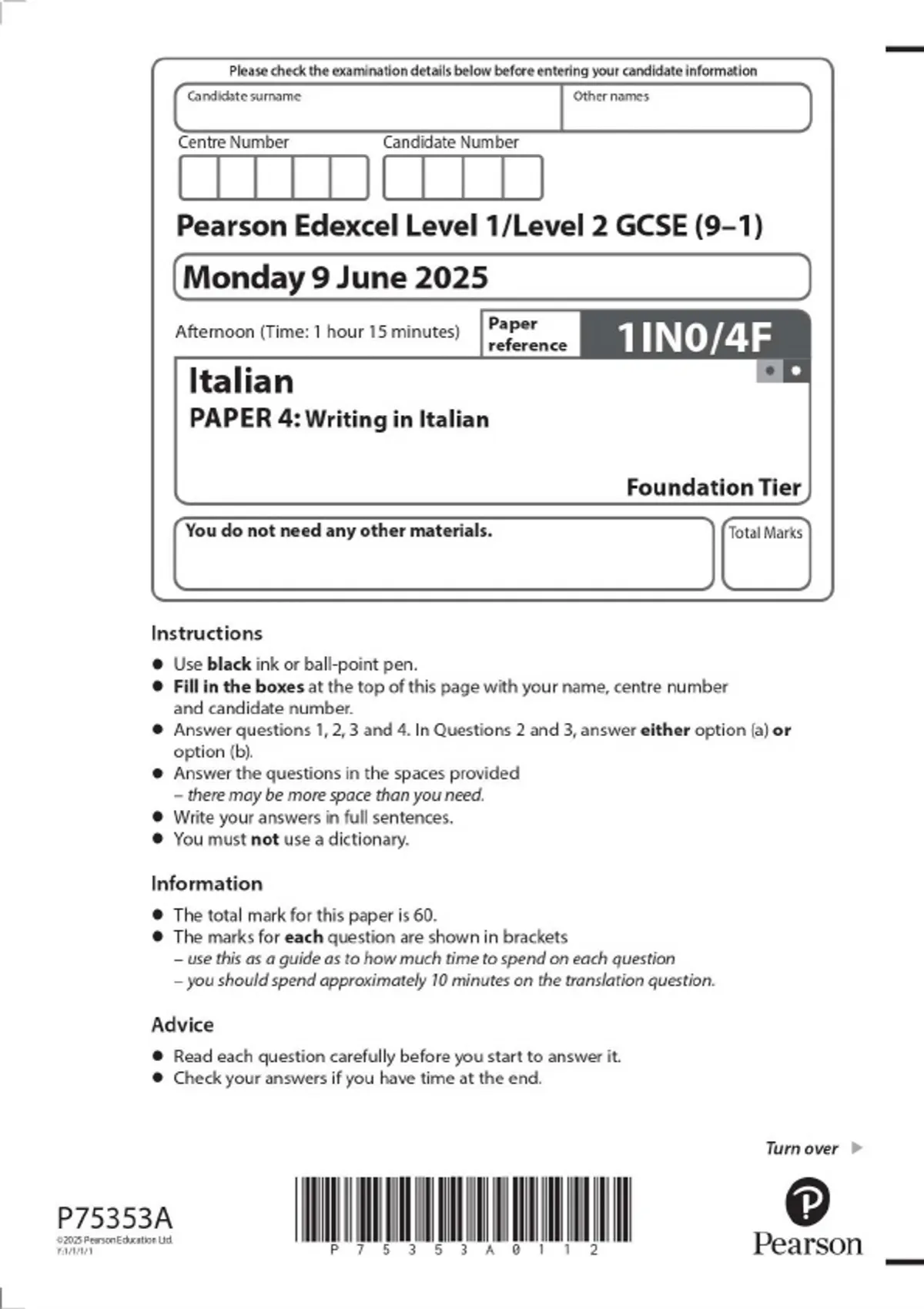 Pearson Edexcel Level 1/Level 2 GCSE (9–1) Italian PAPER 4: Writing in Italian Foundation Tier JUNE 2025 Combined Question Paper and Mark Scheme