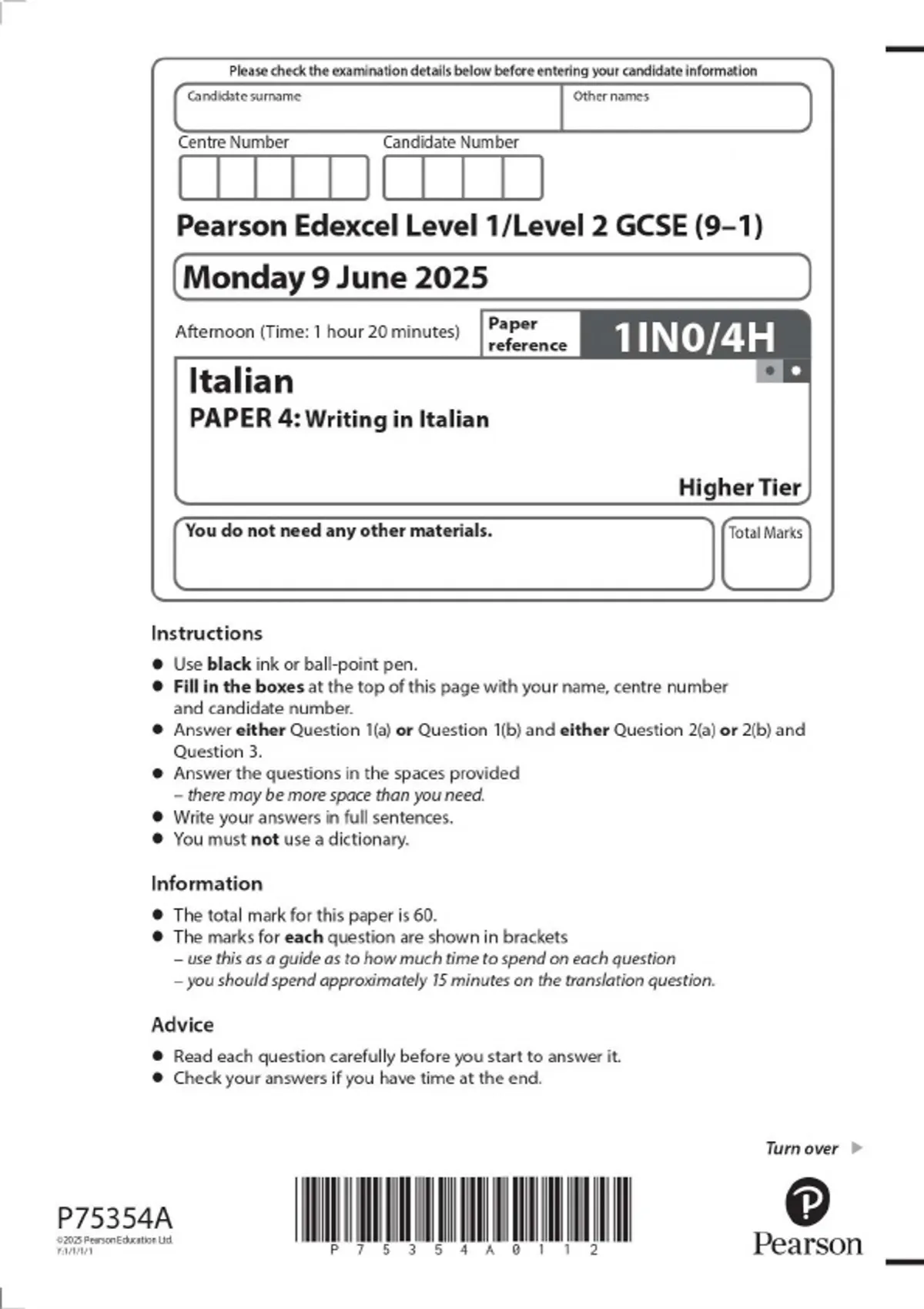 Pearson Edexcel Level 1/Level 2 GCSE (9–1) Italian PAPER 4: Writing in Italian Higher Tier JUNE 2025 Combined Question Paper and Mark Scheme
