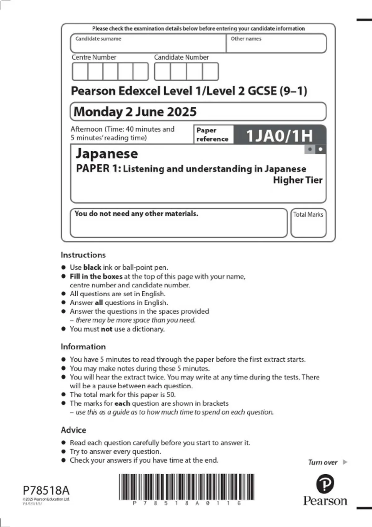 Pearson Edexcel GCSE In Japanese (1JA0) Paper 1H: Listening and understanding in Japanese
