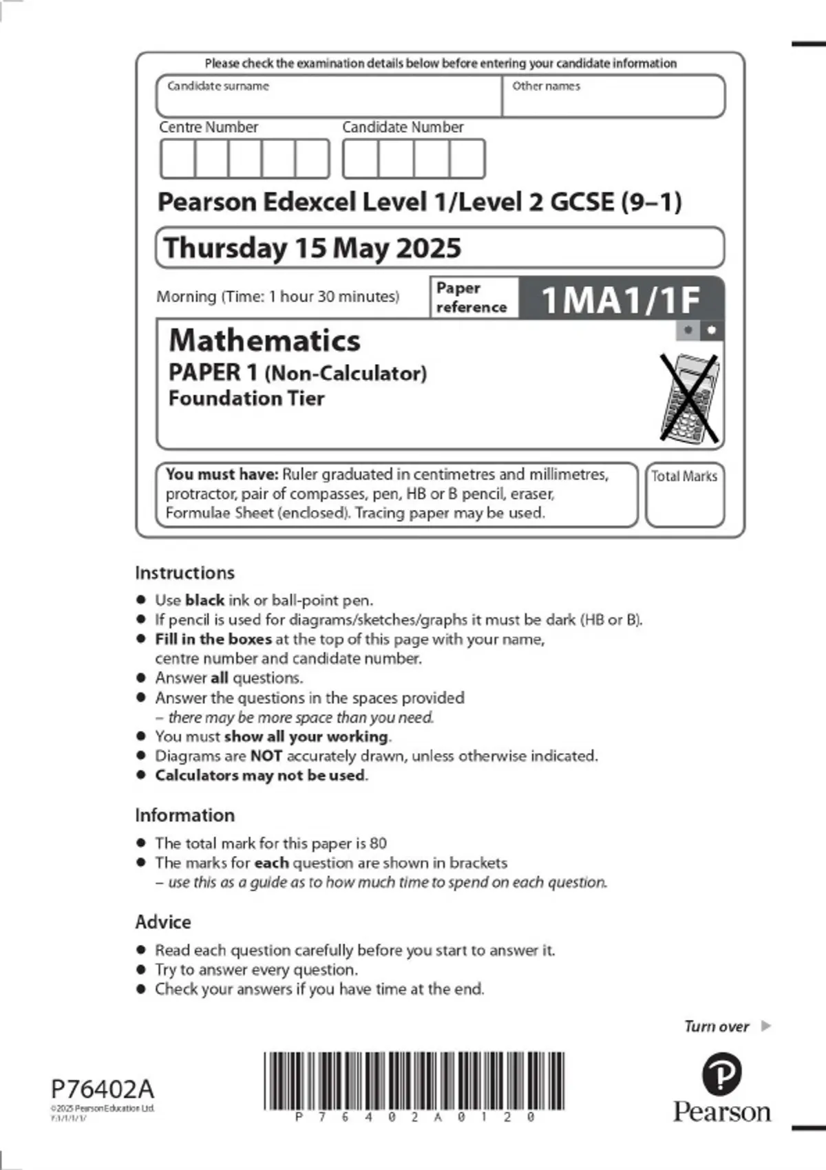 Pearson Edexcel Level1/Level 2 GCSE (9–1) Mathematics PAPER 1 (Non-Calculator) Foundation Tier MAY 2025 Combined Question Paper and Mark Scheme