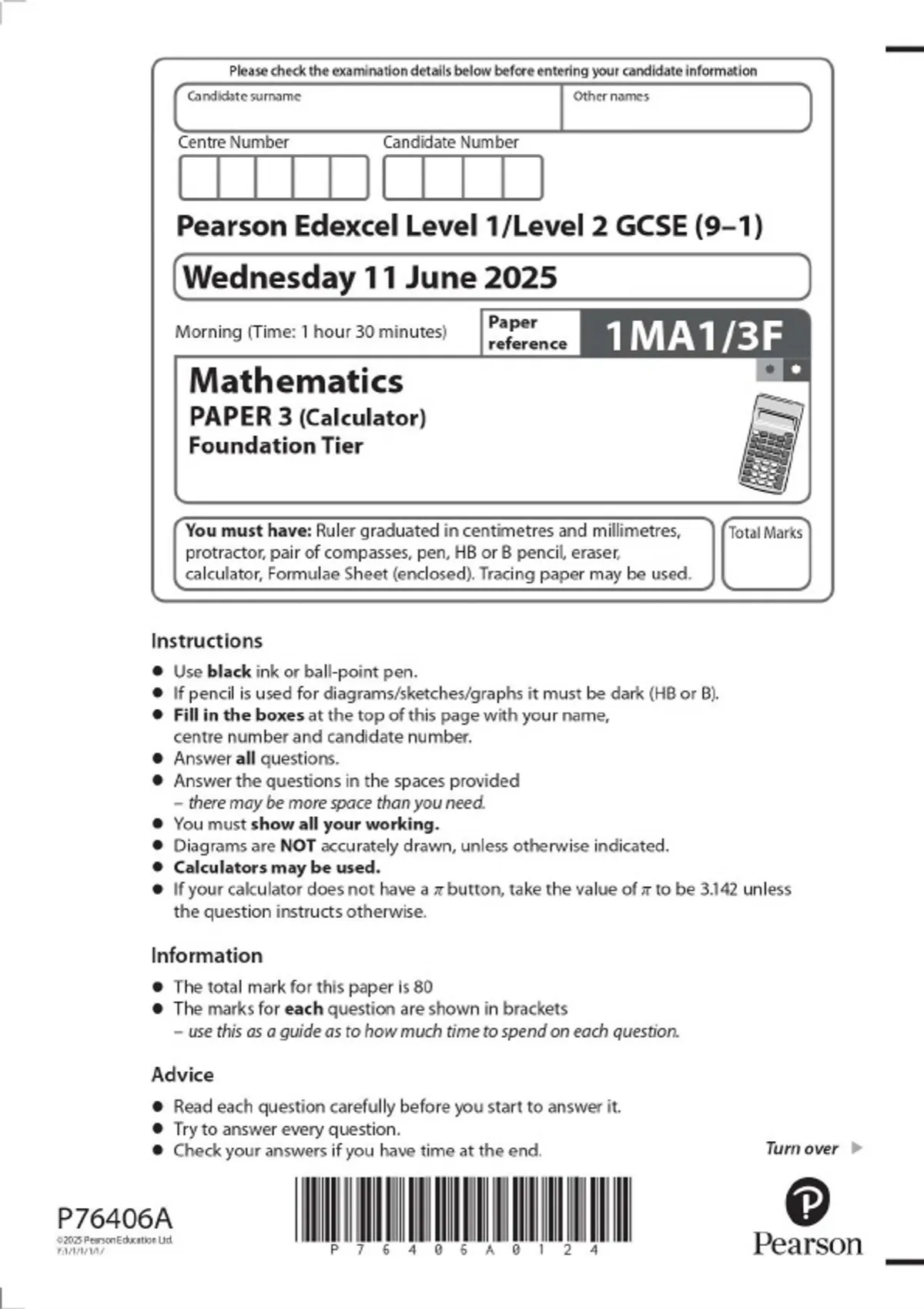 Pearson Edexcel Level 1/Level 2 GCSE (9–1) Mathematics PAPER 3 (Calculator) Foundation Tier JUNE 2025 Combined Question Paper and Mark Scheme