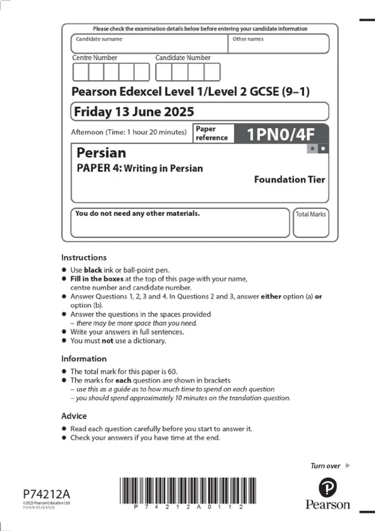 Pearson Edexcel Level 1/Level 2 GCSE (9–1) Persian PAPER 4: Writing in Persian Foundation Tier JUNE 2025 Combined Question Paper and Mark Scheme