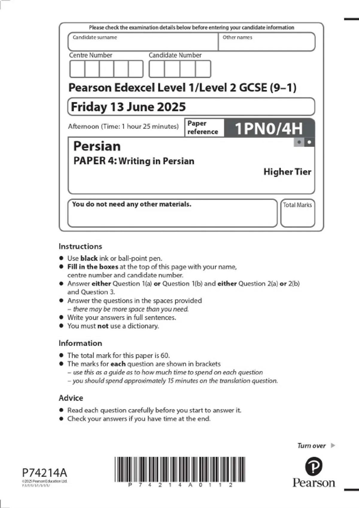 Pearson Edexcel Level 1/Level 2 GCSE (9–1) Persian PAPER 4: Writing in Persian Higher Tier JUNE 2025 Combined Question Paper and Mark Scheme