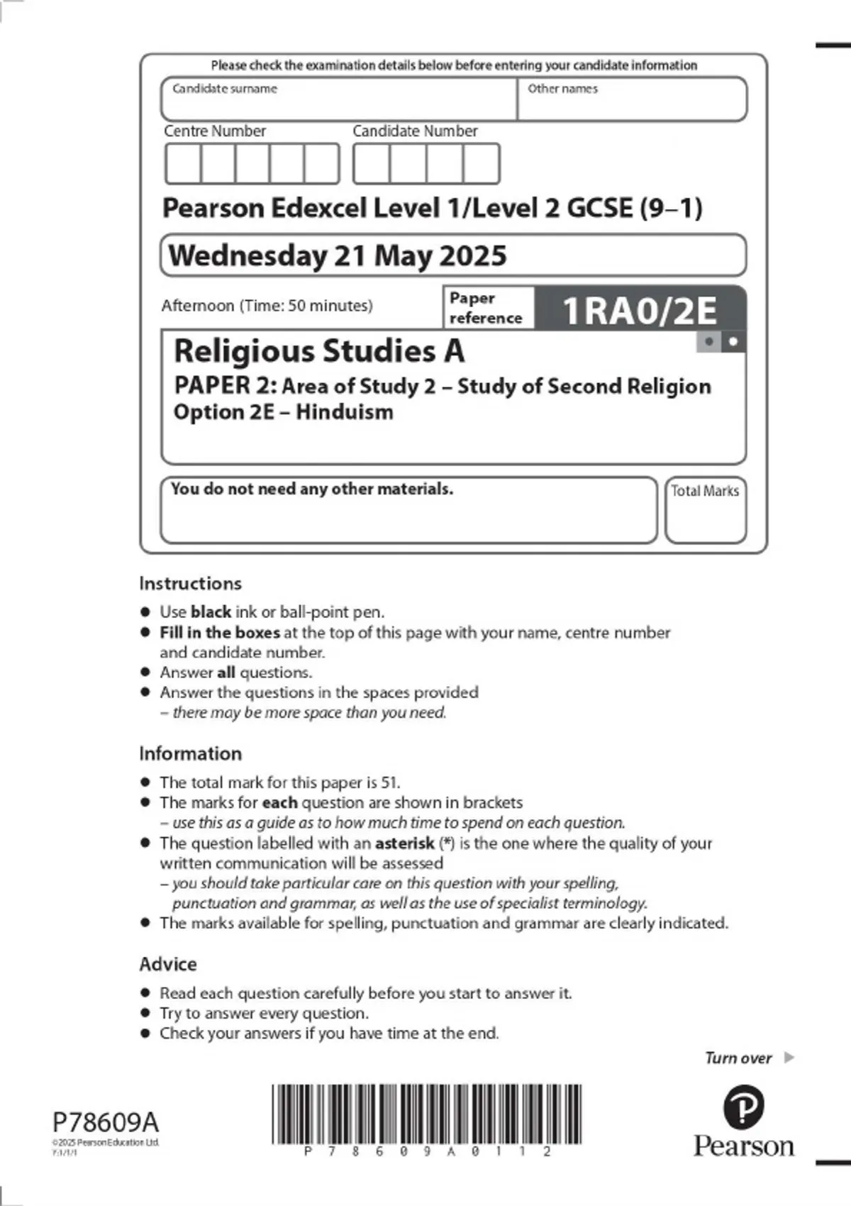 Pearson Edexcel Level 1/Level 2 GCSE (9–1) Religious Studies A PAPER 2: Area of Study 2 – Study of Second Religion Option 2E – Hinduism MAY 2025 Combined Question Paper and Mark Scheme