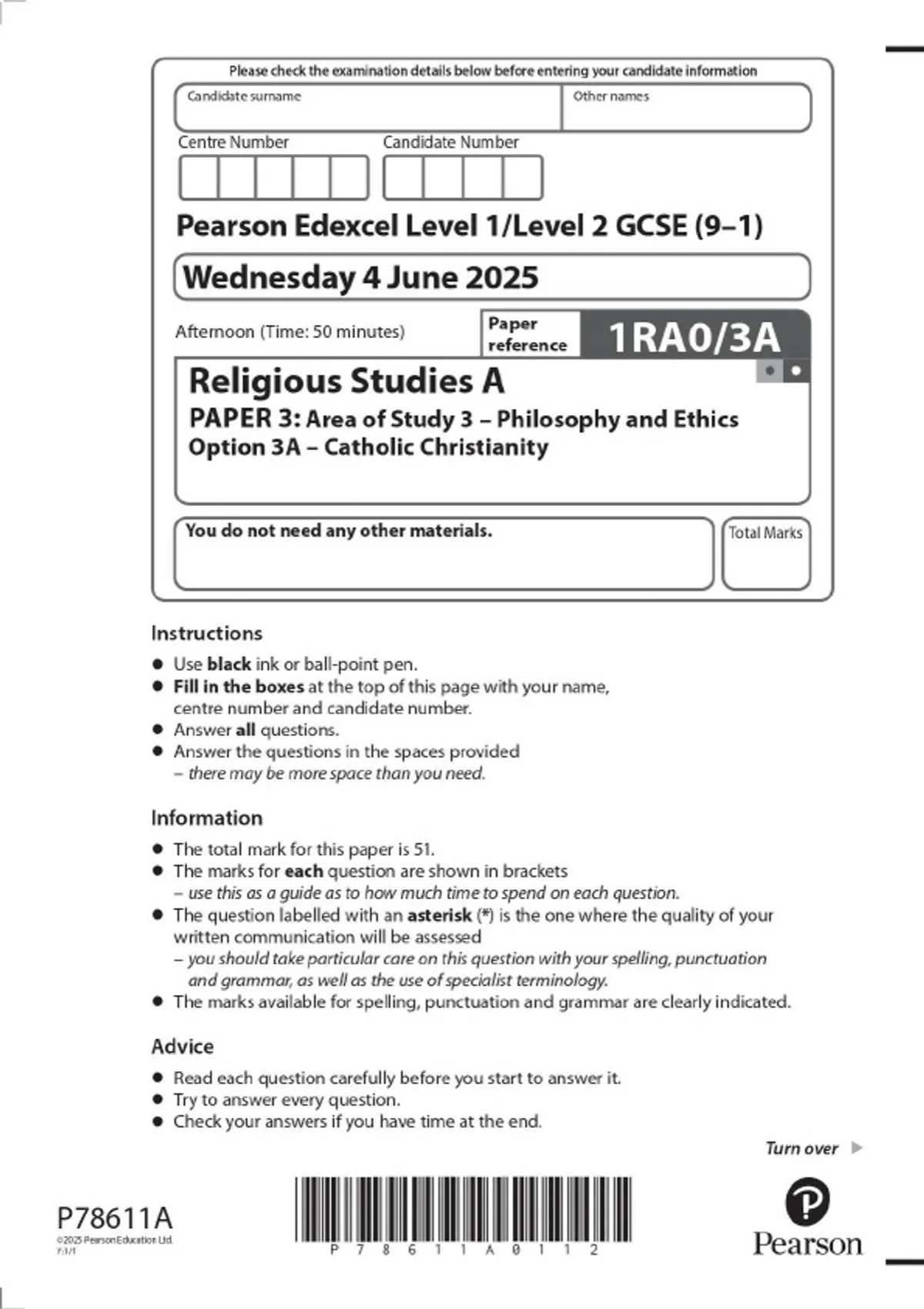Pearson Edexcel Level 1/Level 2 GCSE (9–1) Religious Studies A PAPER 3: Area of Study 3 – Philosophy and Ethics Option 3A – Catholic Christianity 2025 Combined Question Paper and Mark Scheme