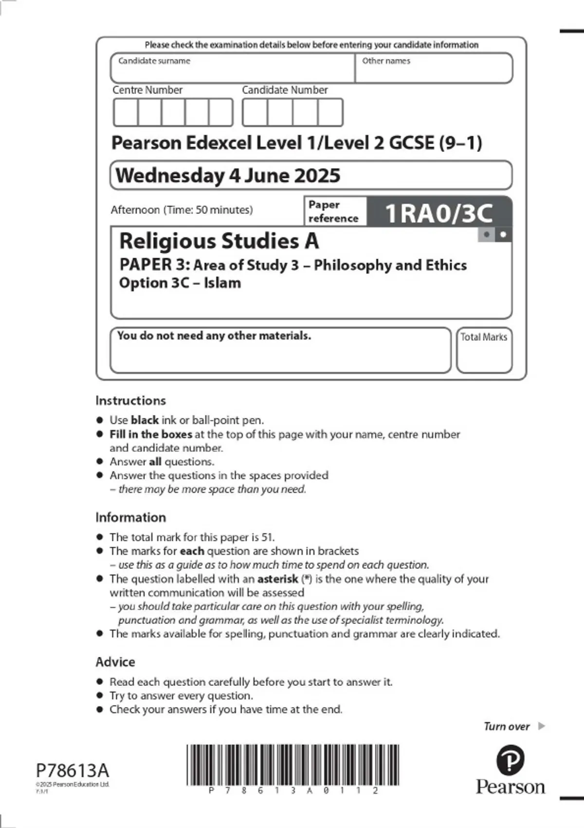 Pearson Edexcel Level 1/Level 2 GCSE (9–1) Religious Studies A PAPER 3: Area of Study 3 – Philosophy and Ethics Option 3C – Islam 2025 Combined Question Paper and Mark Scheme