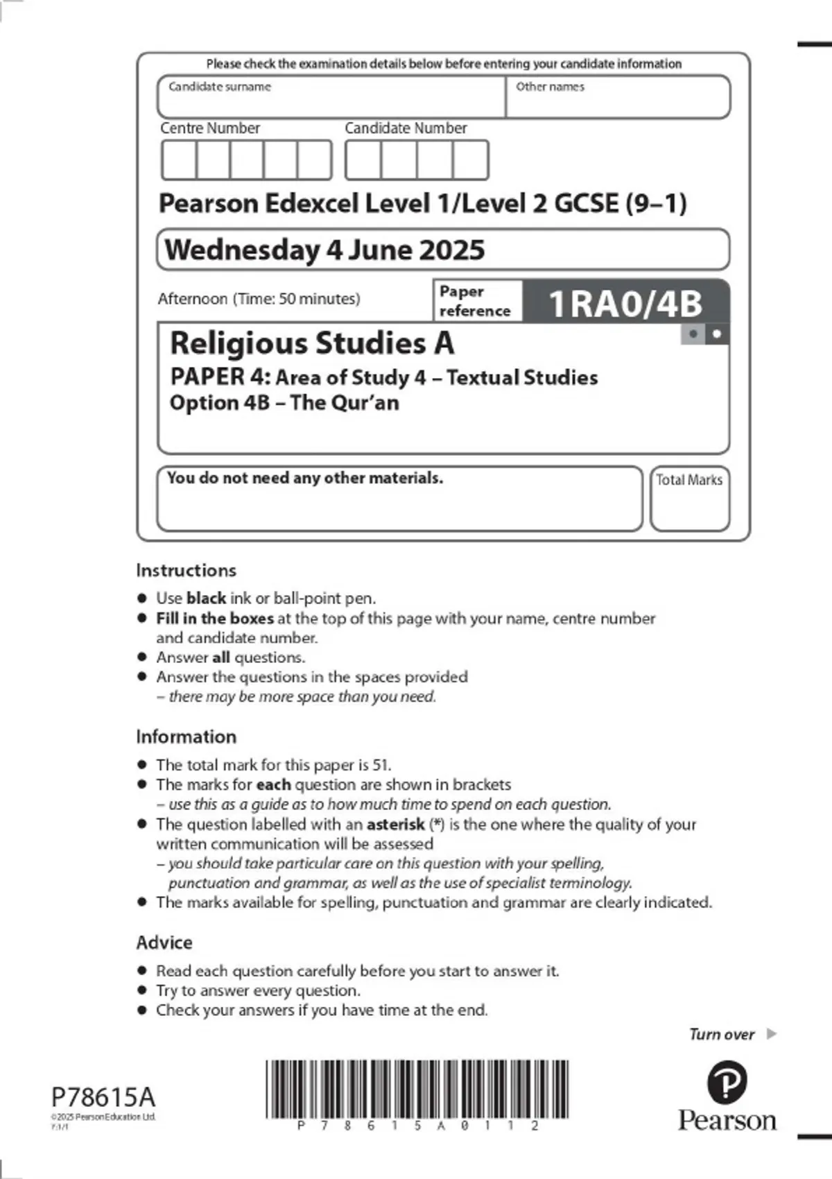 Pearson Edexcel Level 1/Level 2 GCSE (9–1) Religious Studies A PAPER 4: Area of Study 4 – Textual Studies Option 4B – The Qur’an 2025 Combined Question Paper and Mark Scheme