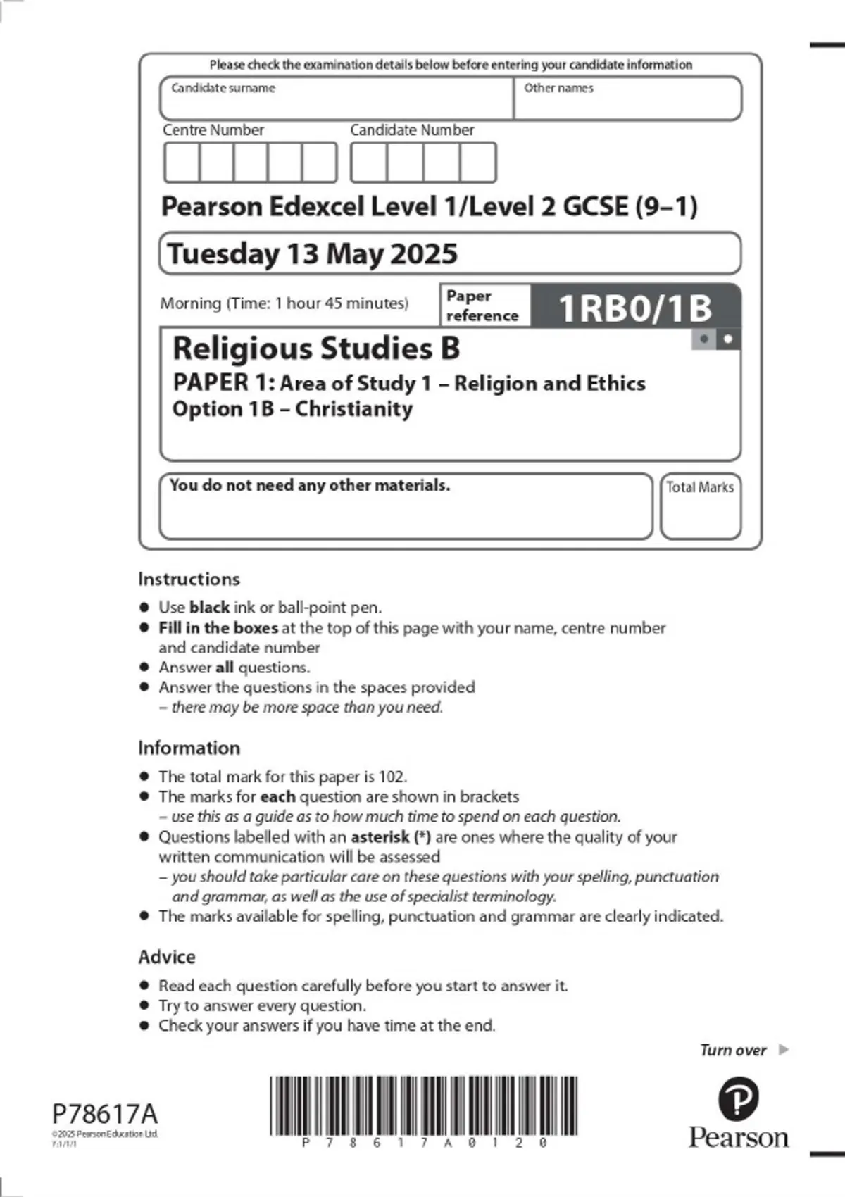 Pearson Edexcel Level 1/Level 2 GCSE (9–1) Religious Study B PAPER 1: Area of Study 1 – Religion and Ethics Option 1B – Christianity 2025 Combined Question Paper and Mark Scheme