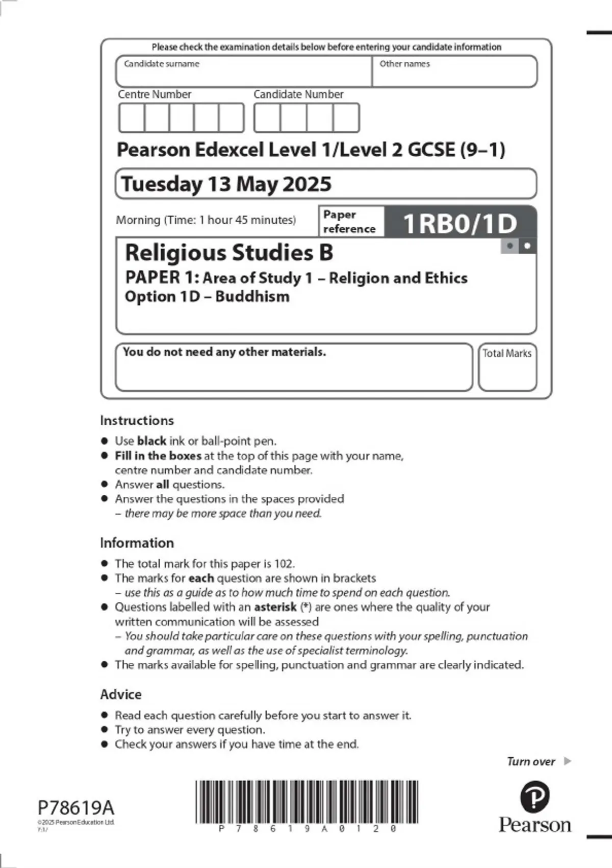Pearson Edexcel Level 1/Level 2 GCSE (9–1) Religious Studies B PAPER 1: Area of Study 1 – Religion and Ethics Option 1D – Buddhism 2025 Combined Question Paper and Mark Scheme