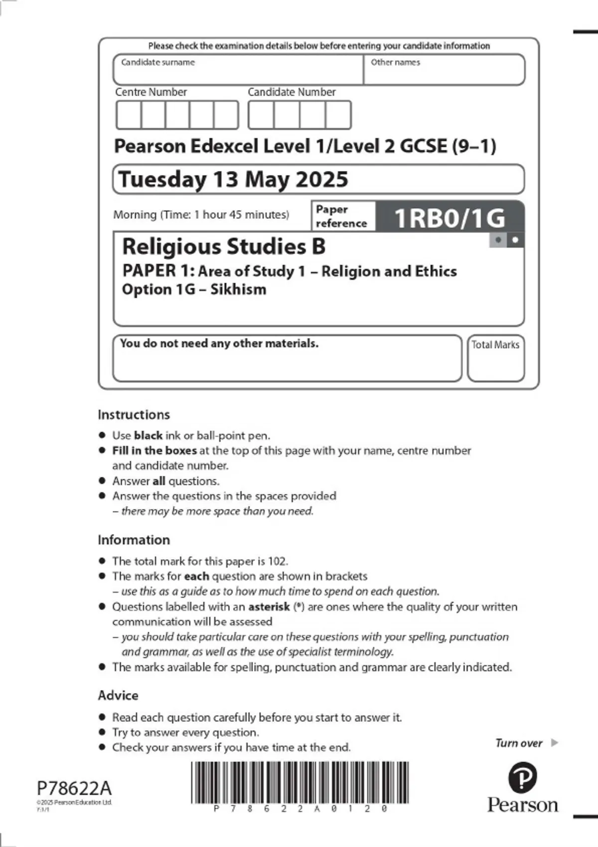 Pearson Edexcel Level 1/Level 2 GCSE (9–1) Religious Studies B PAPER 1: Area of Study 1 – Religion and Ethics Option 1G – Sikhism 2025 Combined Question Paper and Mark Scheme