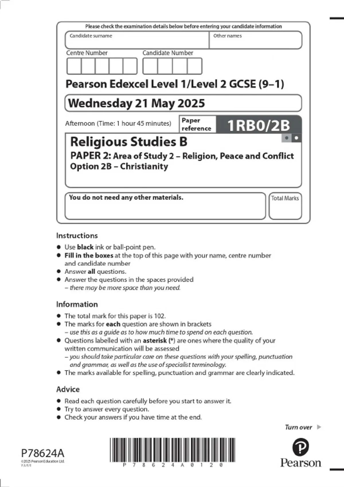 Pearson Edexcel Level 1/Level 2 GCSE (9–1) Religious Studies B PAPER 2: Area of Study 2 – Religion, Peace and Conflict Option 2B – Christianity 2025 Combined Question Paper and Mark Scheme