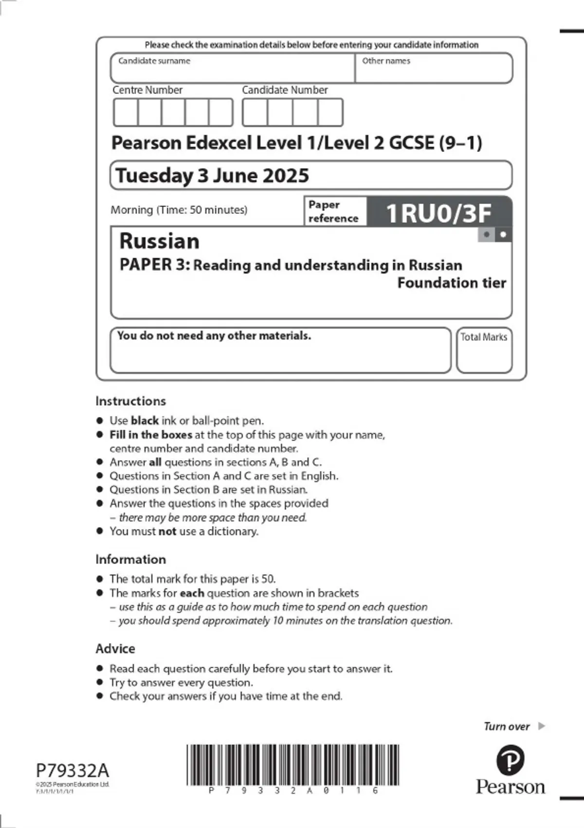 Pearson Edexcel Level 1/Level 2 GCSE (9–1) Russian PAPER 3: Reading and understanding in Russian Foundation tier 2025 Combined Question Paper and Mark Scheme