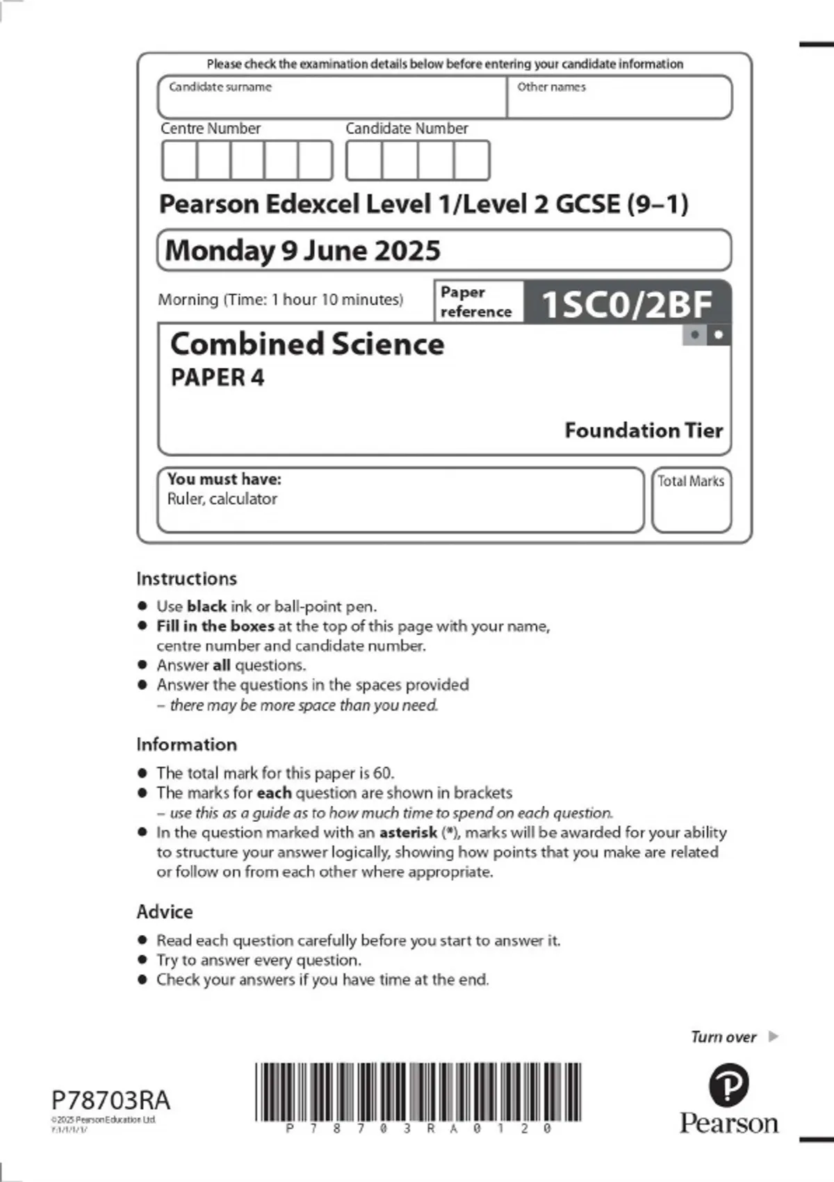 Pearson Edexcel Level 1/Level 2 GCSE (9–1) Combined Science PAPER 4 Foundation Tier 2025 Combined Question Paper and Mark Scheme