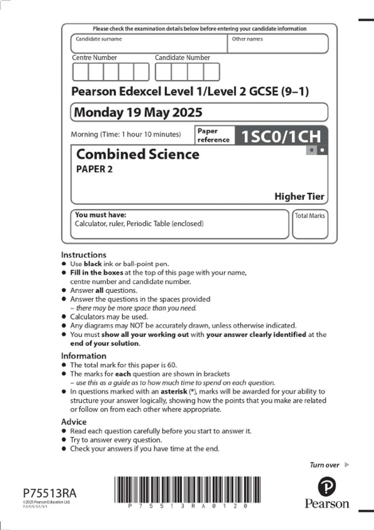 Pearson Edexcel Level 1/Level 2 GCSE (9–1) Combined Science PAPER 2 Higher Tier 2025 Combined Question Paper and Mark Scheme