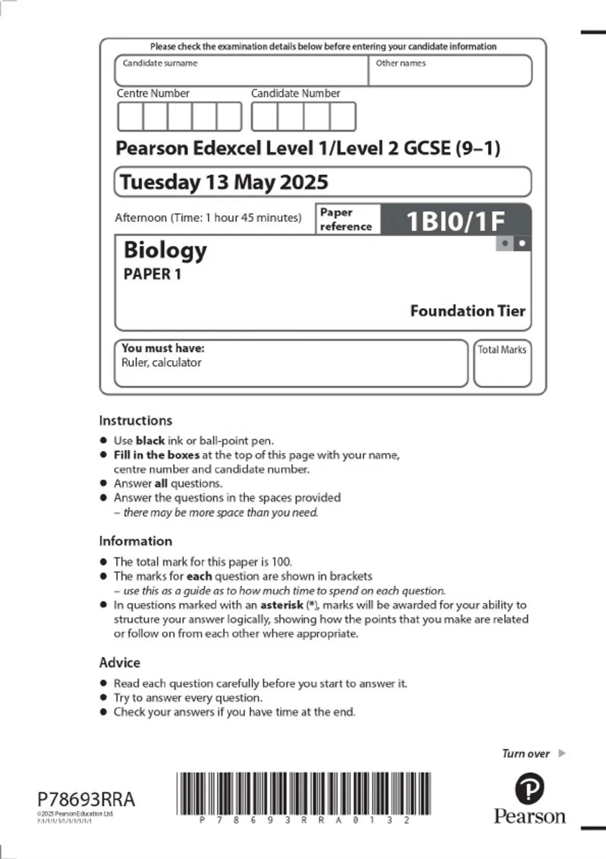 Pearson Edexcel Level 1/Level 2 GCSE (9–1) Biology PAPER 1 Foundation Tier 2025 Combined Question Paper and Mark Scheme
