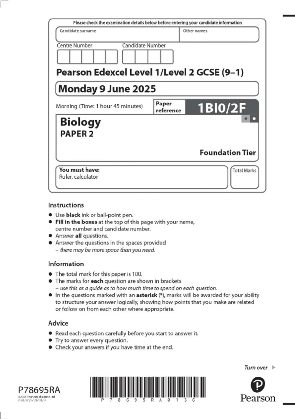 Pearson Edexcel Level 1/Level 2 GCSE (9–1) Biology PAPER 2 Foundation Tier 2025 Combined Question Paper and Mark Scheme