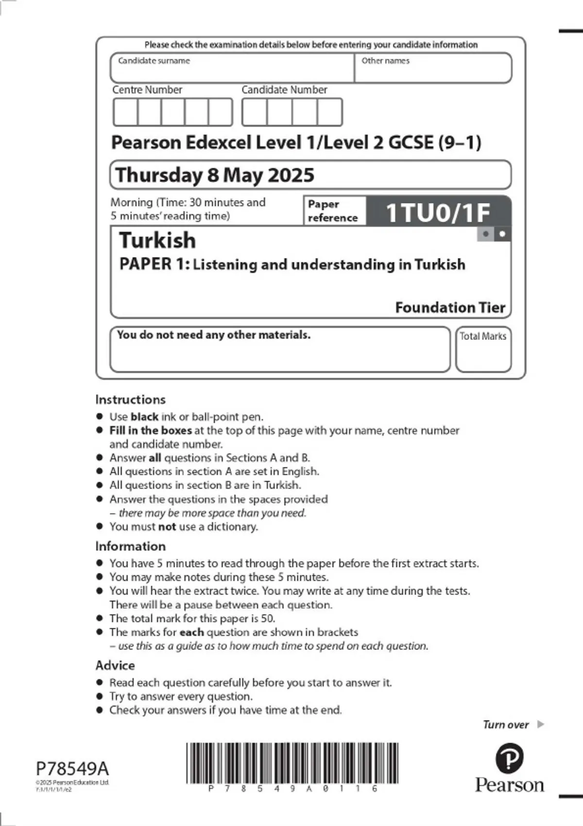 Pearson Edexcel Level 1/Level 2 GCSE (9–1) PAPER 1: Listening and understanding in Turkish Foundation Tier 2025 Combined Question Paper and Mark Scheme