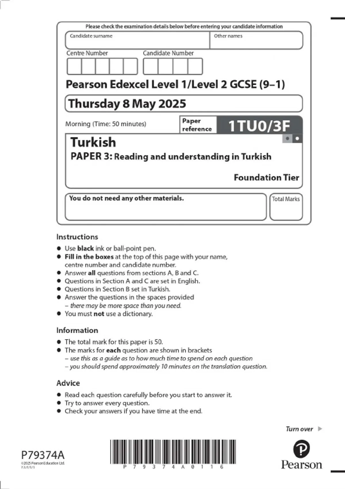 Pearson Edexcel Level 1/Level 2 GCSE (9–1) Turkish PAPER 3: Reading and understanding in Turkish Foundation Tier 2025 Combined Question Paper and Mark Scheme