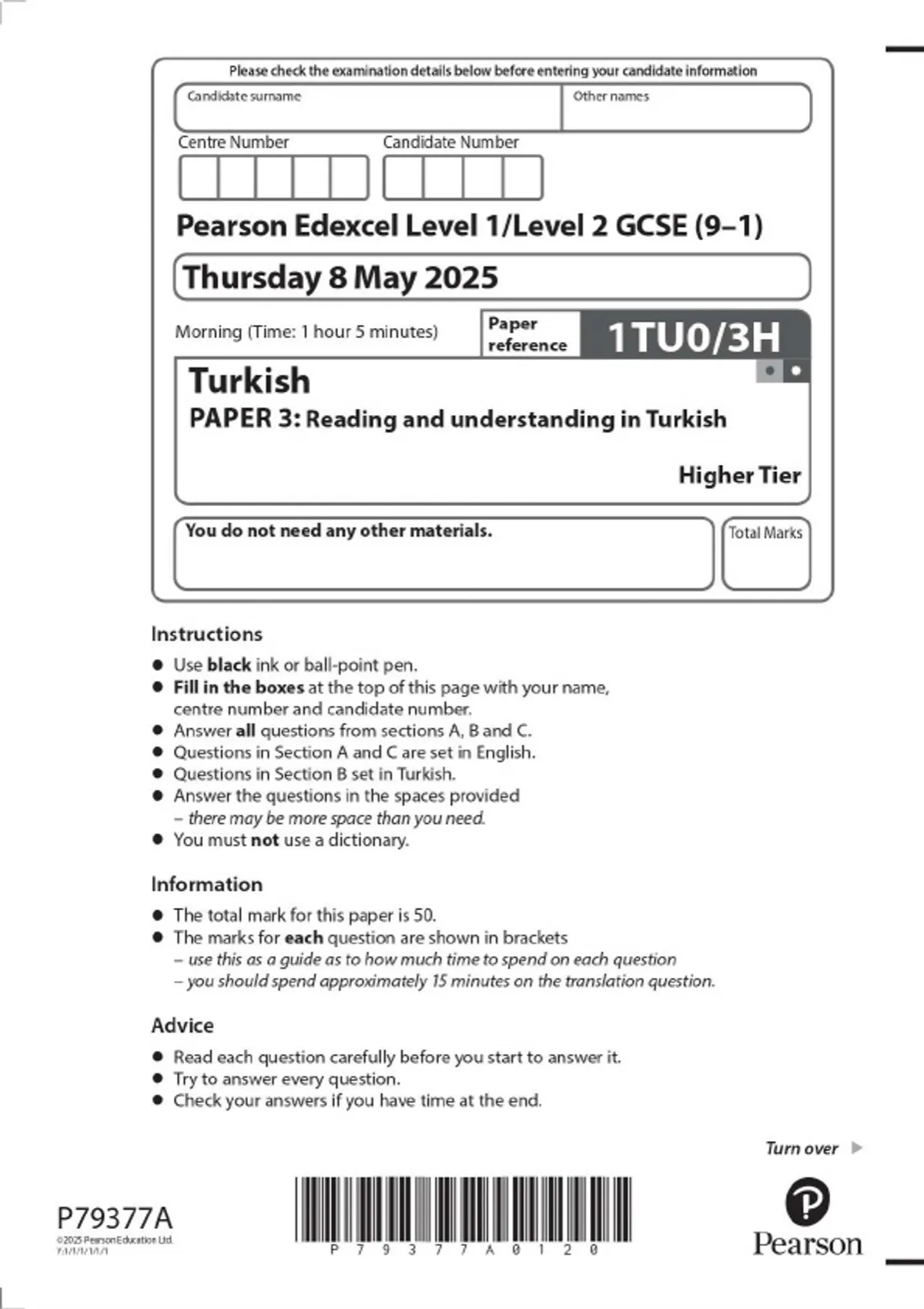 Pearson Edexcel Level 1/Level 2 GCSE (9–1) Turkish PAPER 3: Reading and understanding in Turkish Higher Tier 2025 Combined Question Paper and Mark Scheme