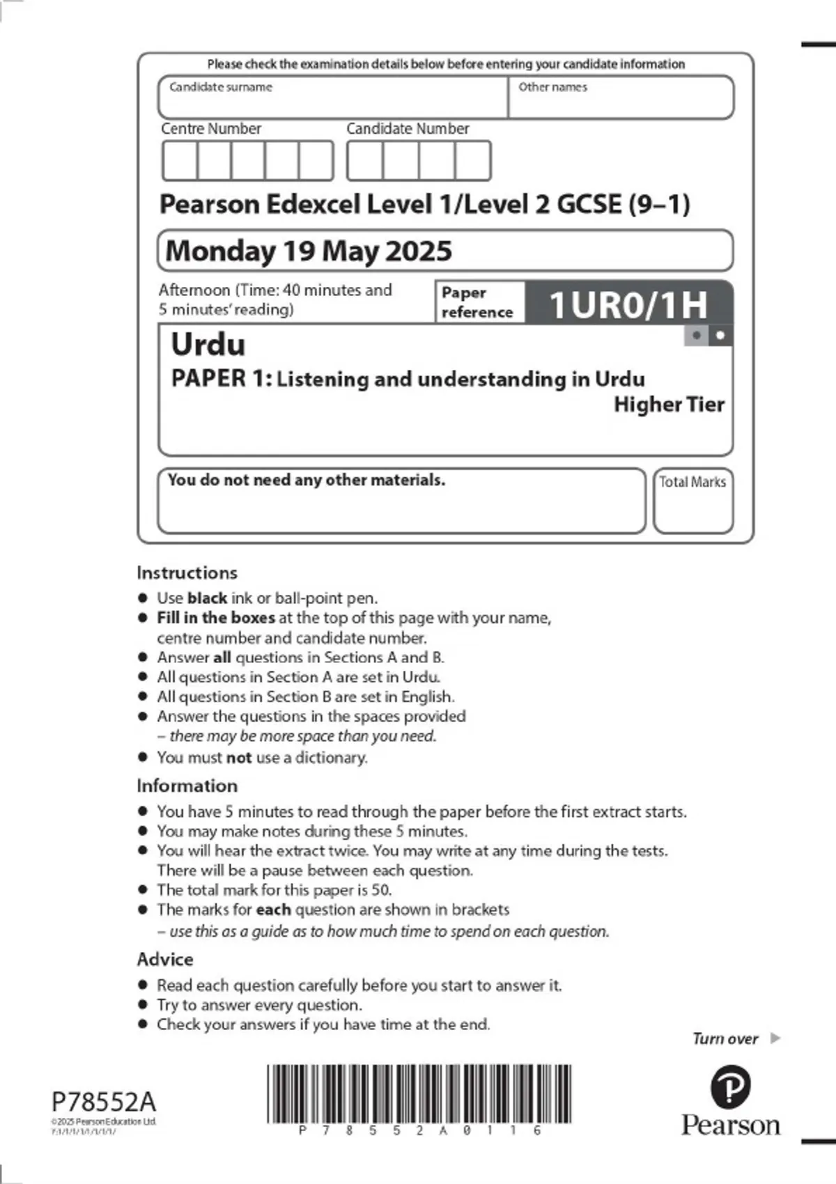 Pearson Edexcel Level 1/Level 2 GCSE (9–1) Urdu PAPER 1: Listening and understanding in Urdu Higher Tier 2025 Combined Question Paper and Mark Scheme