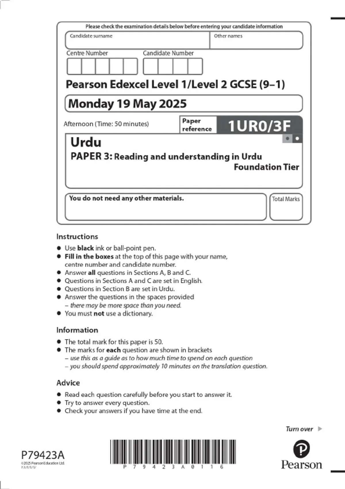 Pearson Edexcel Level 1/Level 2 GCSE (9–1) Urdu PAPER 3: Reading and understanding in Urdu Foundation Tier 2025 Combined Question Paper and Mark Scheme
