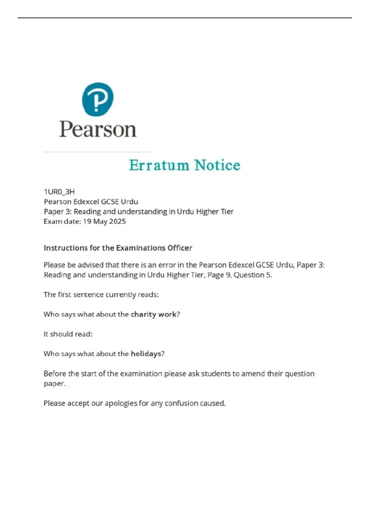 Pearson Edexcel Level 1/Level 2 GCSE (9–1) Urdu PAPER 3: Reading and understanding in Urdu Higher Tier 2025 Combined Question Paper and Mark Scheme