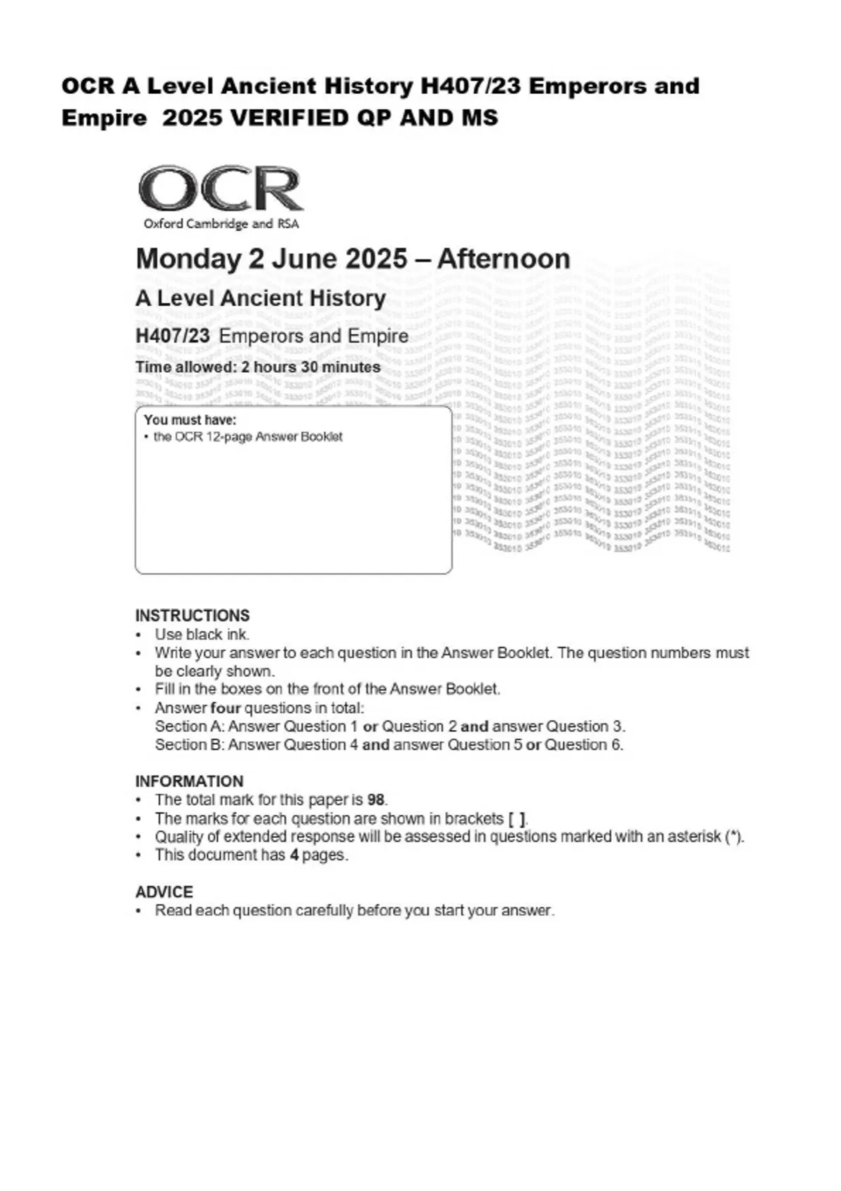 OCR A Level Ancient History H407/23 Emperors and Empire 2025 VERIFIED QP AND MS
