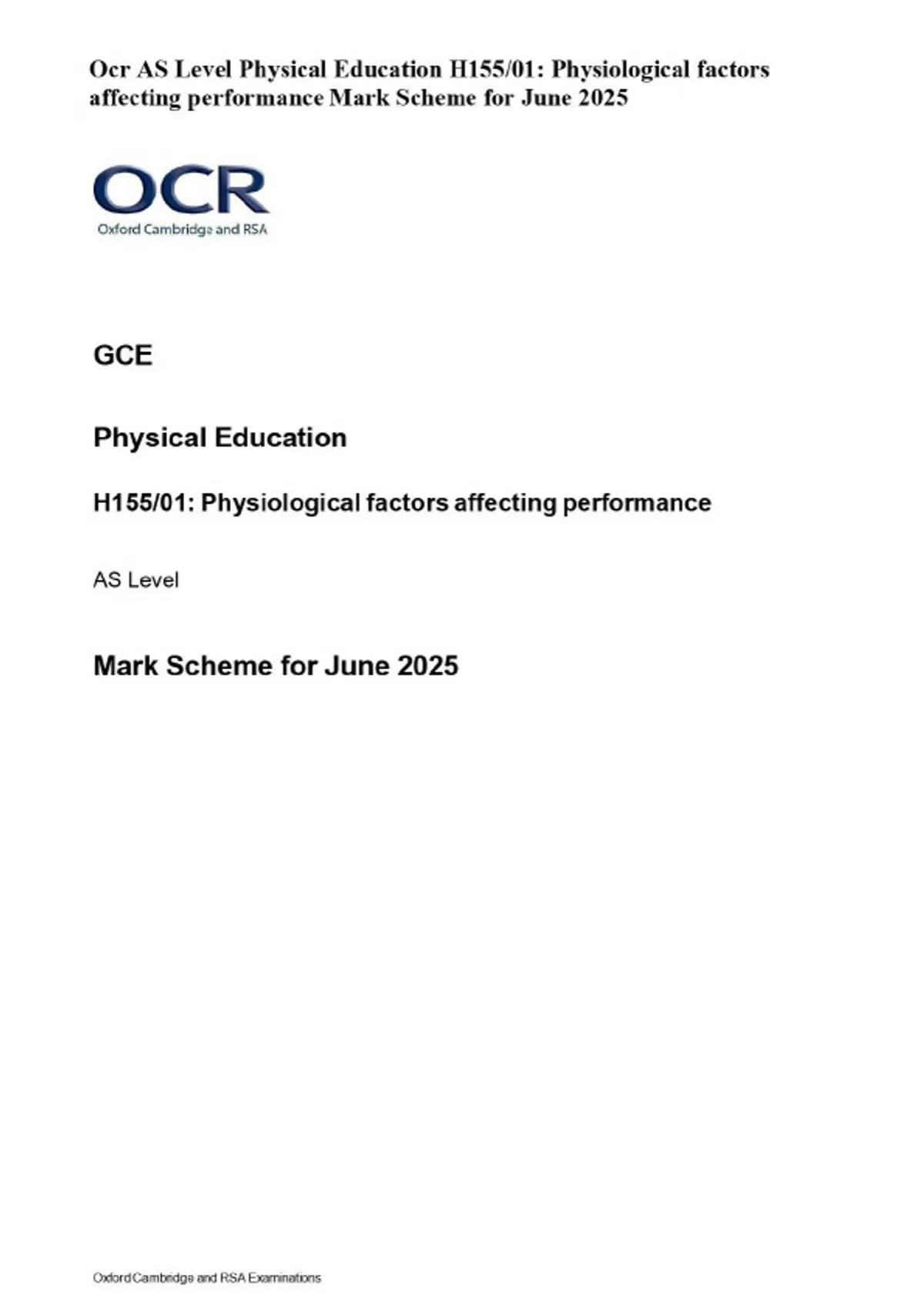 Ocr AS Level Physical Education H155/01: Physiological factors affecting performance Mark Scheme for June 2025