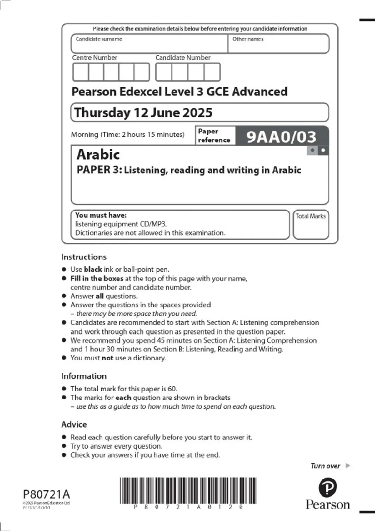 Pearson Edexcel Level 3 GCE Arabic Advanced 2025 Combined Question Paper and Mark Scheme