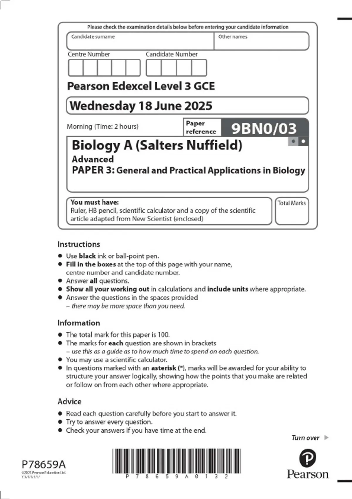 Pearson Edexcel Level 3 GCE Biology A ( Salters Nuffied ) Advanced PAPER 3: General and Practical Applications in Biology 2025 Combined Question Paper and Mark Scheme