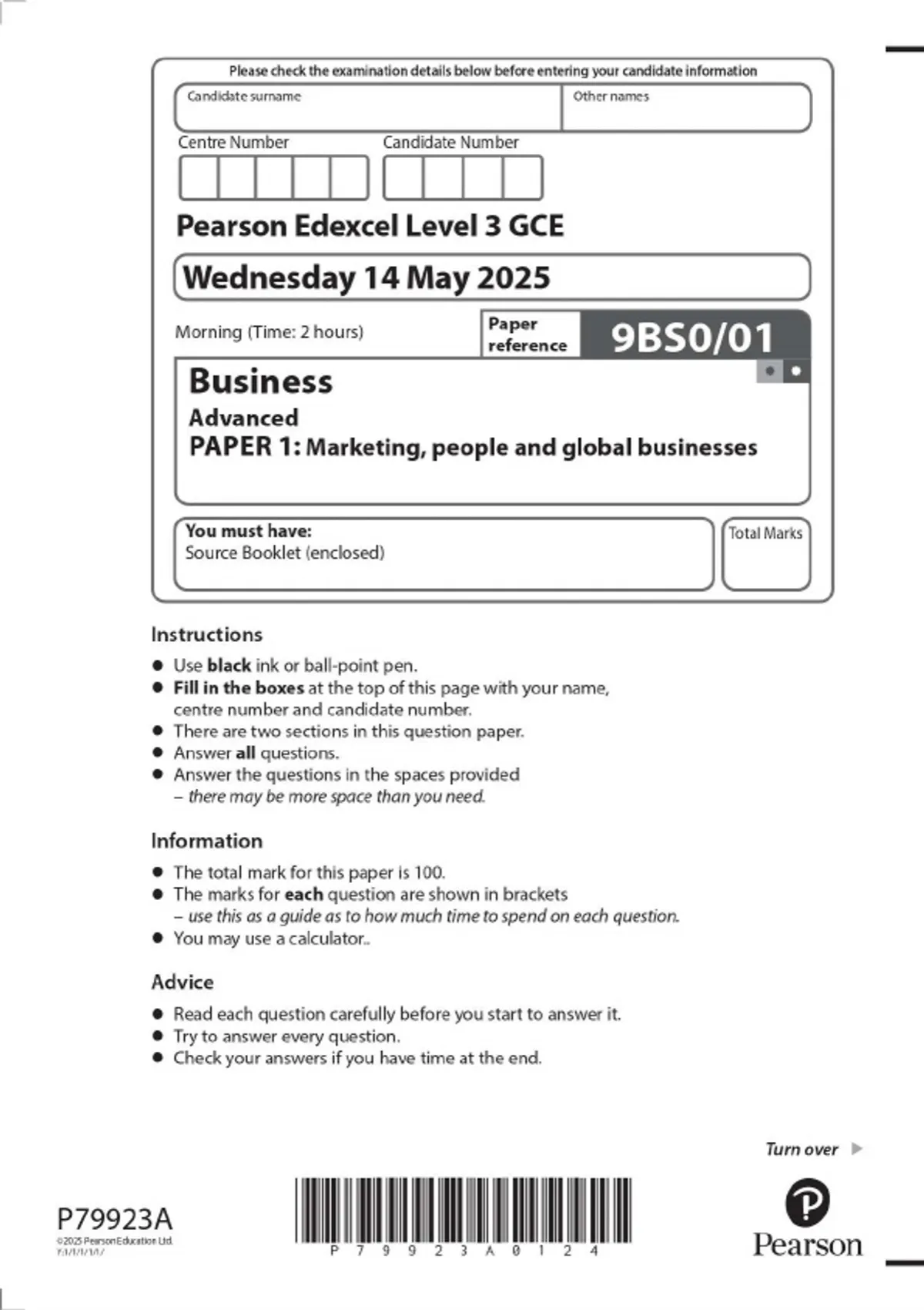 Pearson Edexcel Level 3 GCE Business Advanced PAPER 1: Marketing, people and global businesses 2025 Combined Question Paper and Mark Scheme