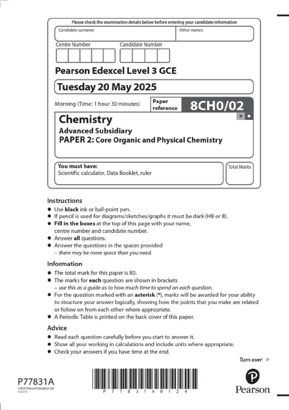 Pearson Edexcel Level 3 GCE Chemistry Advanced Subsidiary Organic and Physical PAPER 2: Core Chemistry 2025 Combined Question Paper and Mark Scheme