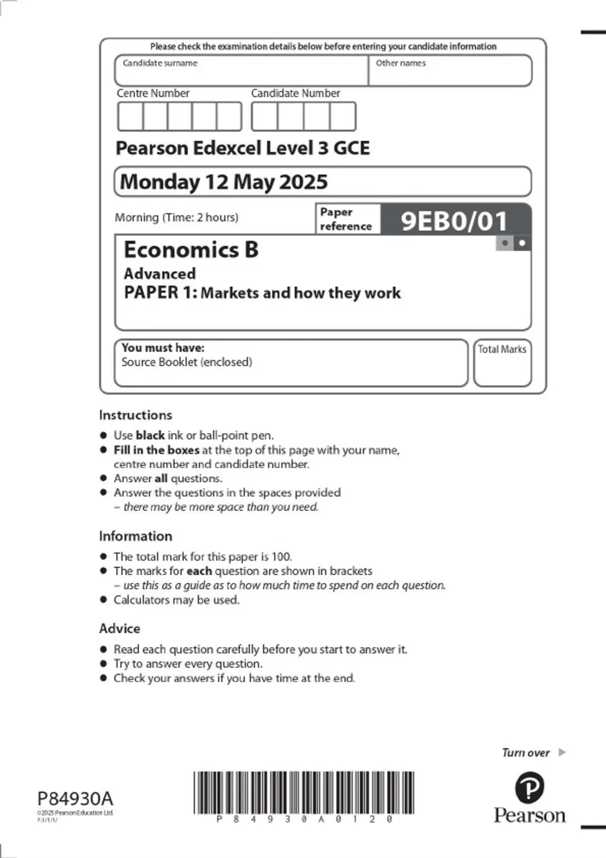 Pearson Edexcel Level 3 GCE Economics B Advanced PAPER 1: Markets and how they work 2025 Combined Question Paper and Mark Scheme