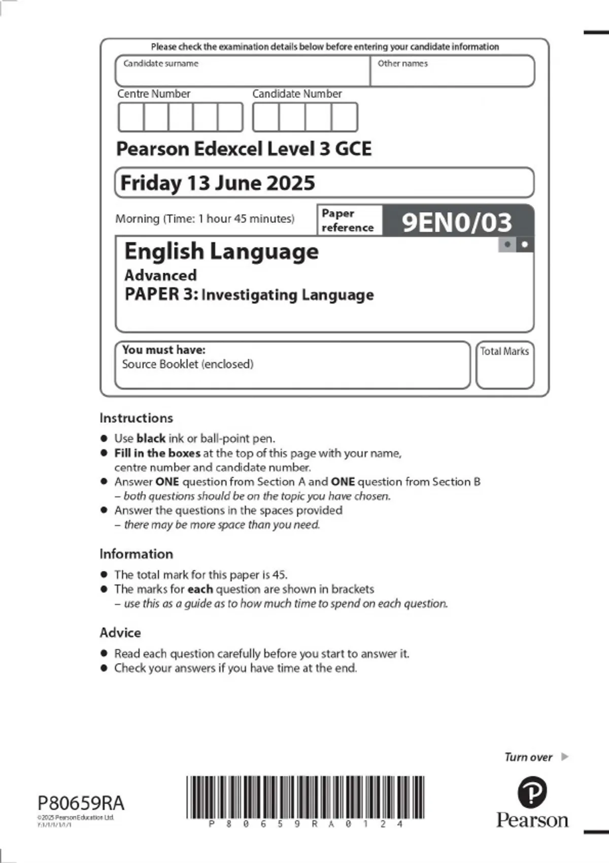 Pearson Edexcel Level 3 GCE English Language Advanced PAPER 3: Investigating Language 2025 Combined Question Paper and Mark Scheme