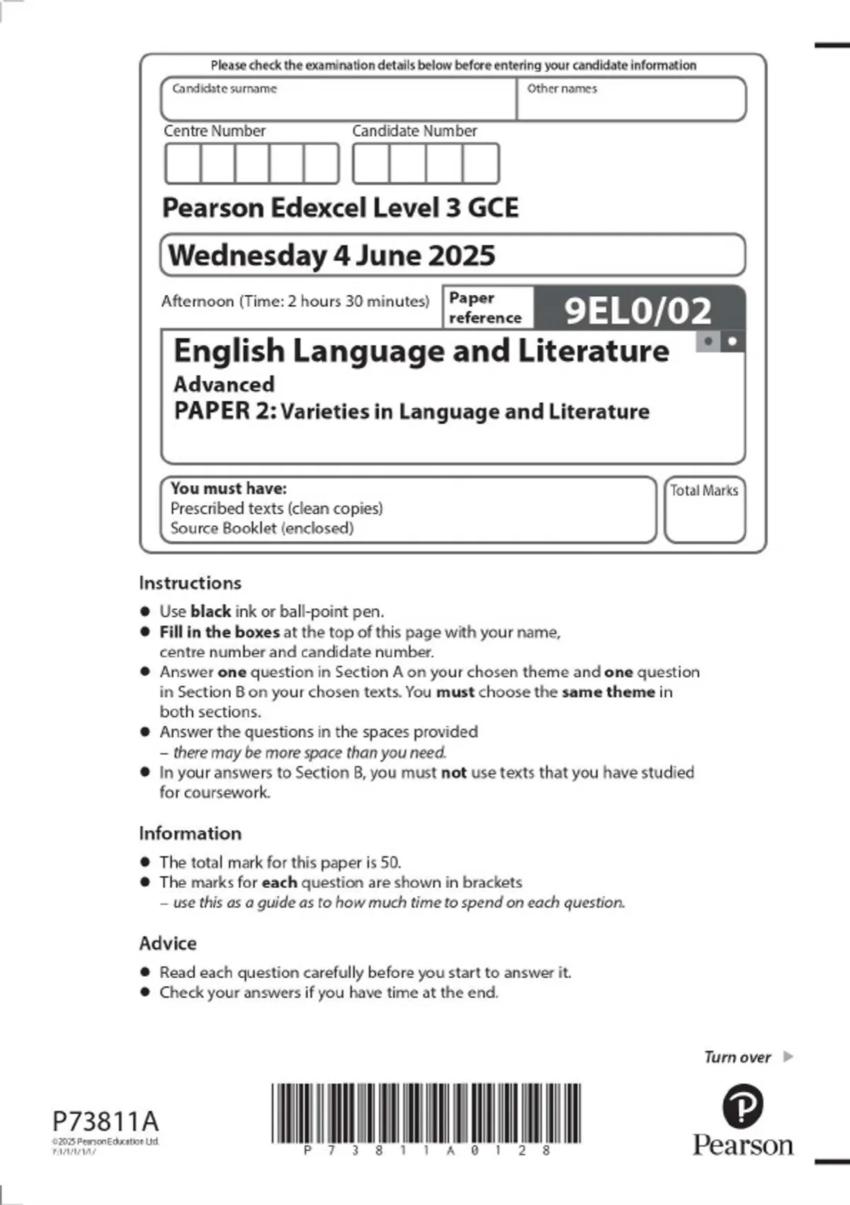 Pearson Edexcel Level 3 GCE English Language and Literature Advanced PAPER 2: Varieties in Language and Literature 2025 Combined Question Paper and Mark Scheme