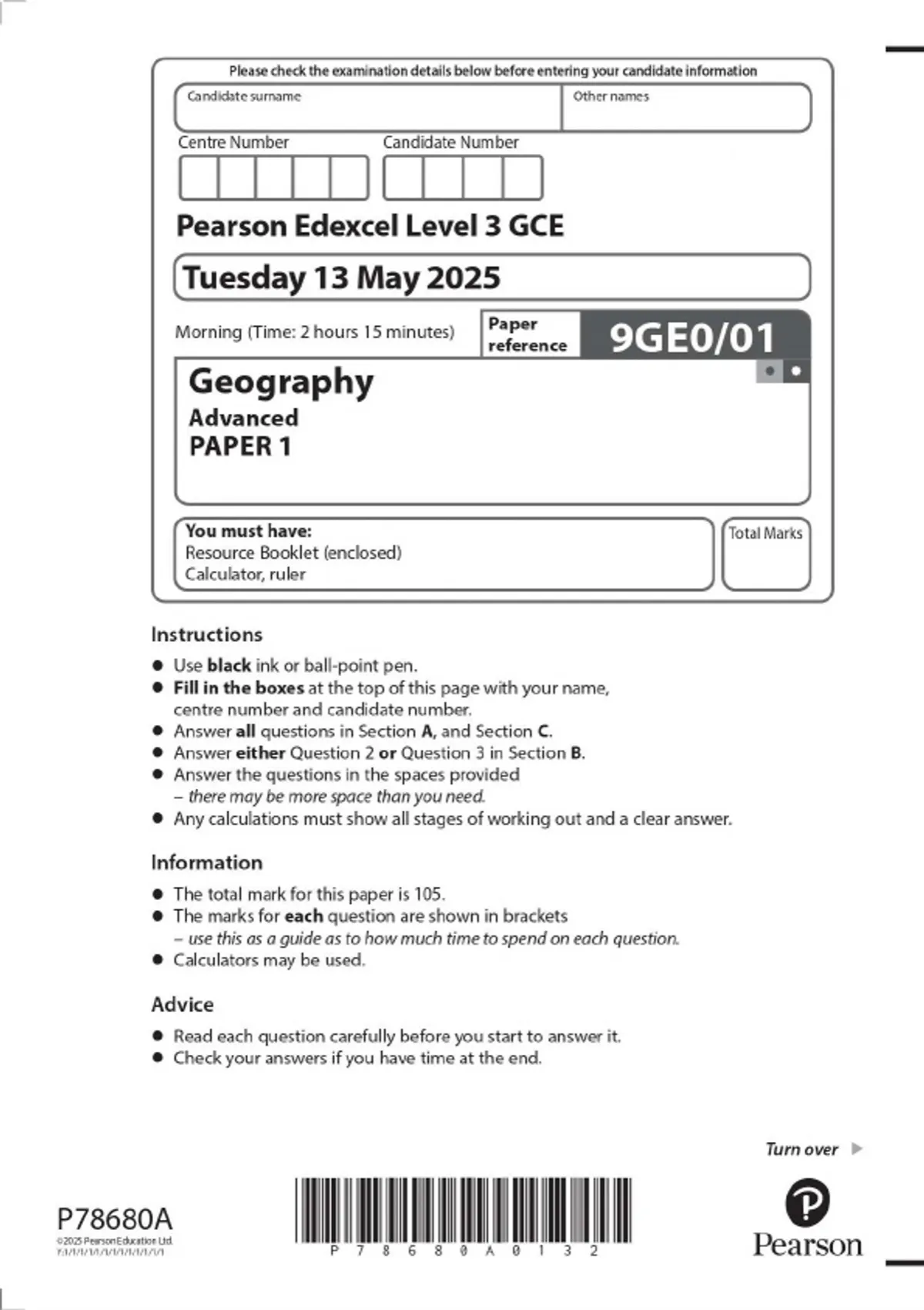 Pearson Edexcel Level 3 GCE Geography Advanced PAPER 1 2025 Combined Question Paper and Mark Scheme