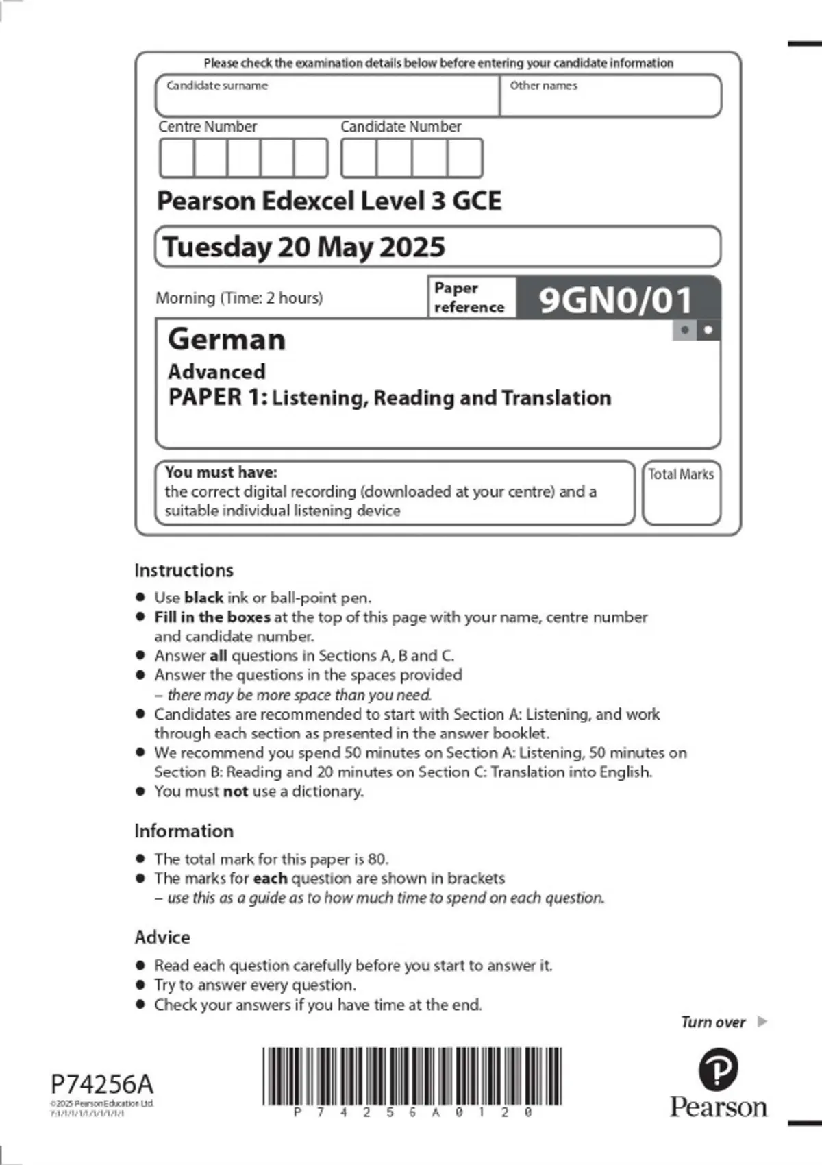 Pearson Edexcel Level 3 GCE German Advanced PAPER 1: Listening, Reading and Translation 2025 Combined Question Paper and Mark Scheme