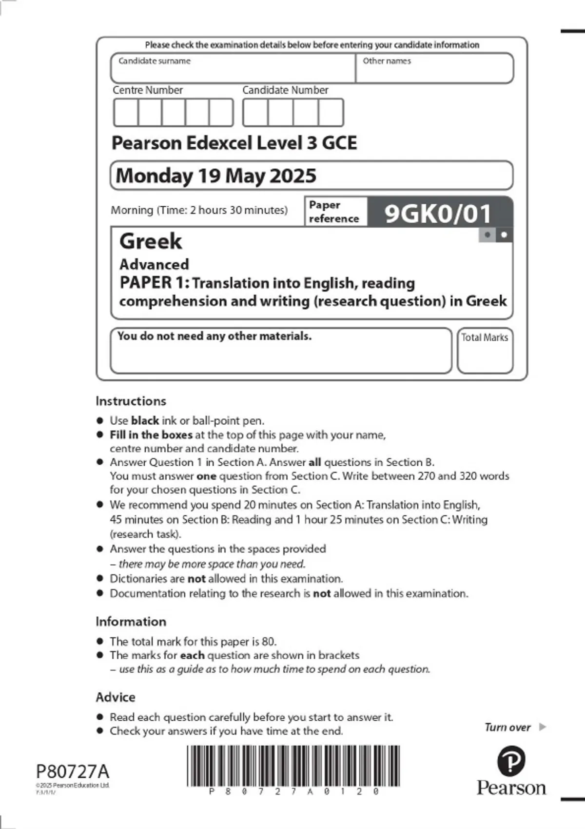 Pearson Edexcel Level 3 GCE Greek Advanced PAPER 1: Translation into English, reading comprehension and writing (research question) in Greek 2025 Combined Question Paper and Mark Scheme