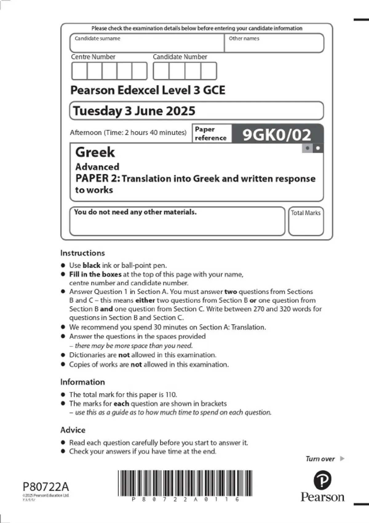 Pearson Edexcel Level 3 GCE Greek Advanced PAPER 2: Translation into Greek and written response to works 2025 Combined Question Paper and Mark Scheme