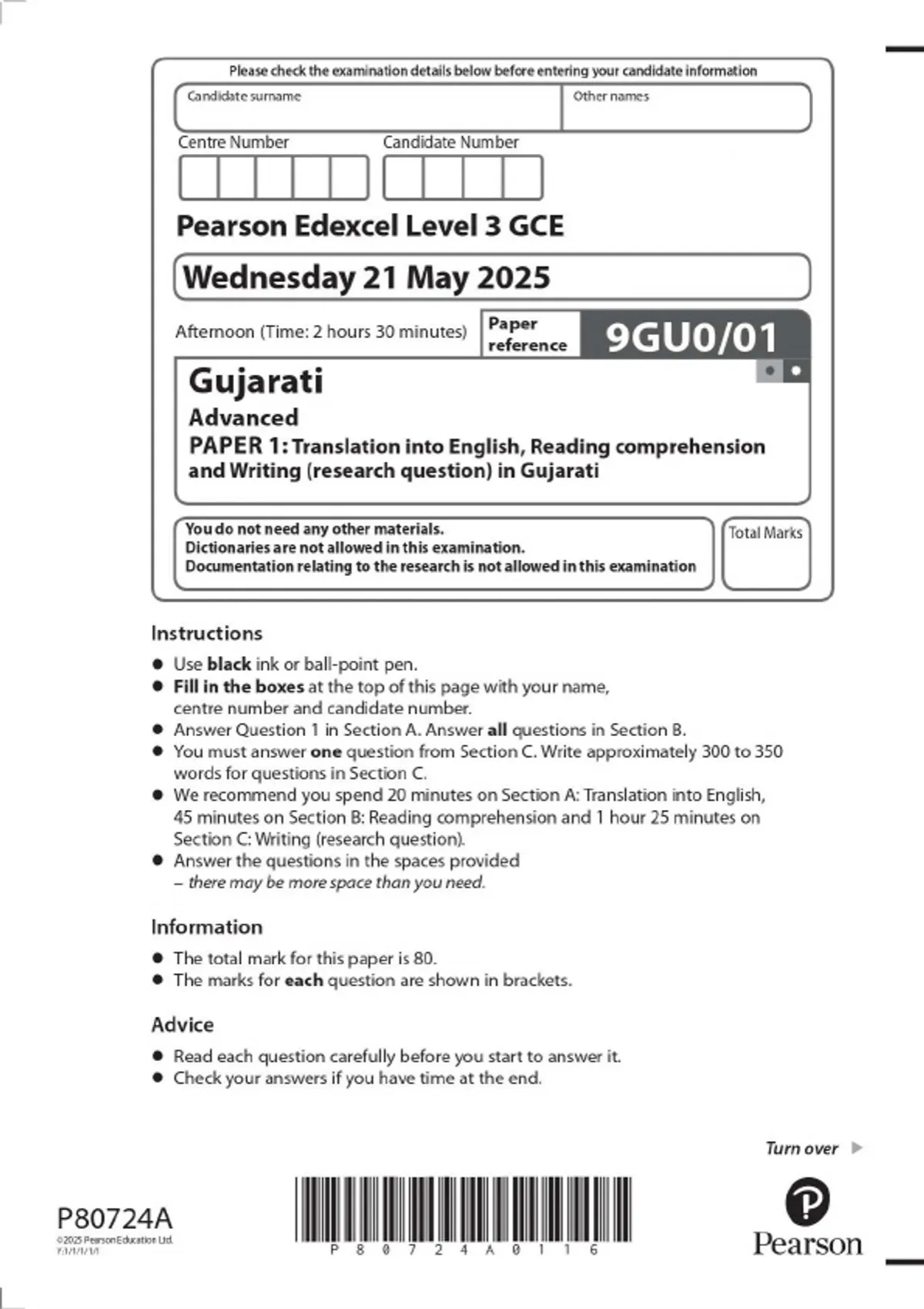 Pearson Edexcel Level 3 GCE Gujarati Advanced PAPER 1: Translation into English, Reading comprehension and Writing (research question) in Gujarati 2025 Combined Question Paper and Mark Scheme