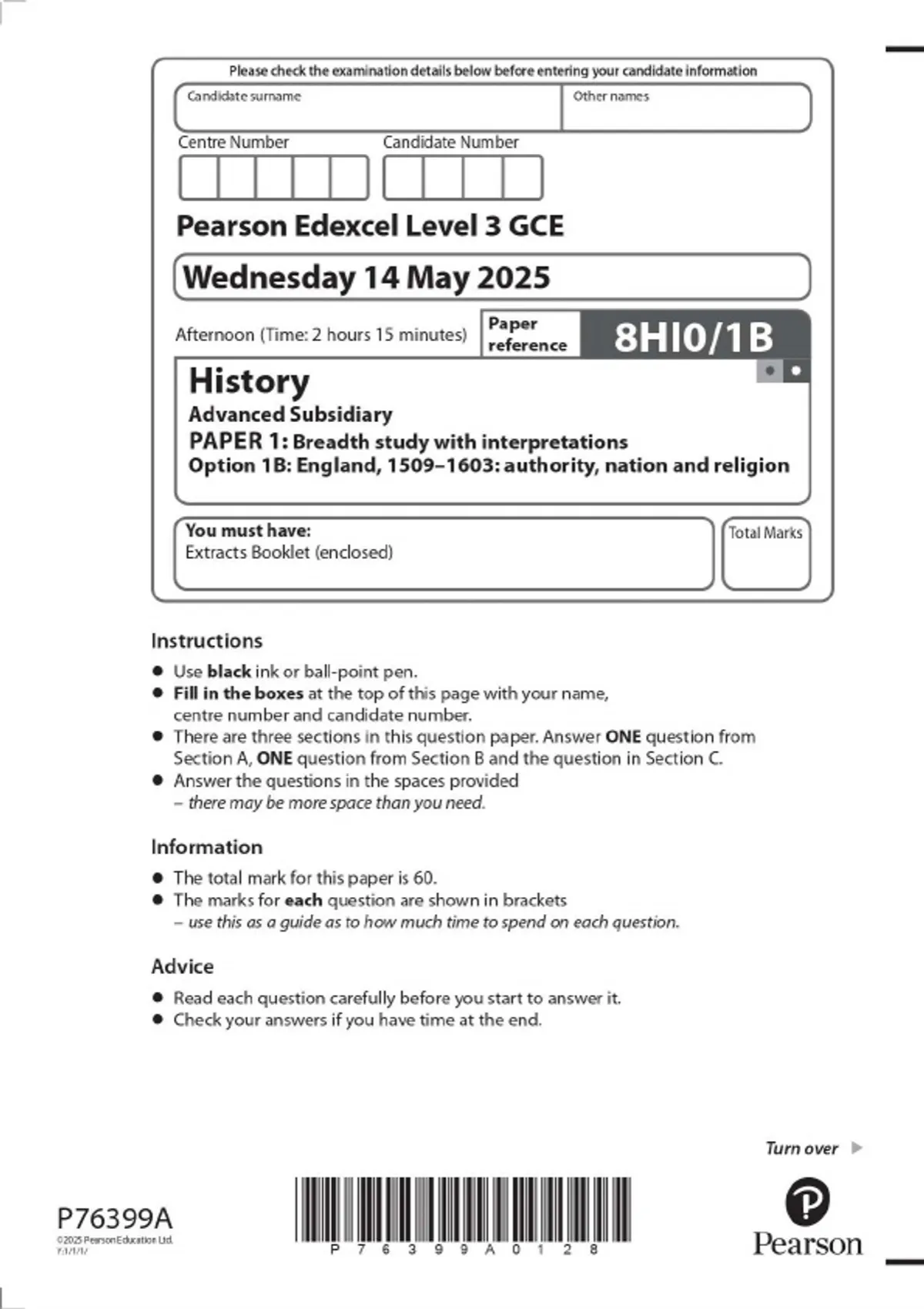 Pearson Edexcel Level 3 GCE History Advanced Subsidiary PAPER 1: Breadth study with interpretations Option 1B: England, 1509–1603: authority, nation and religion MAY 2025 Combined Question Paper and Mark Scheme