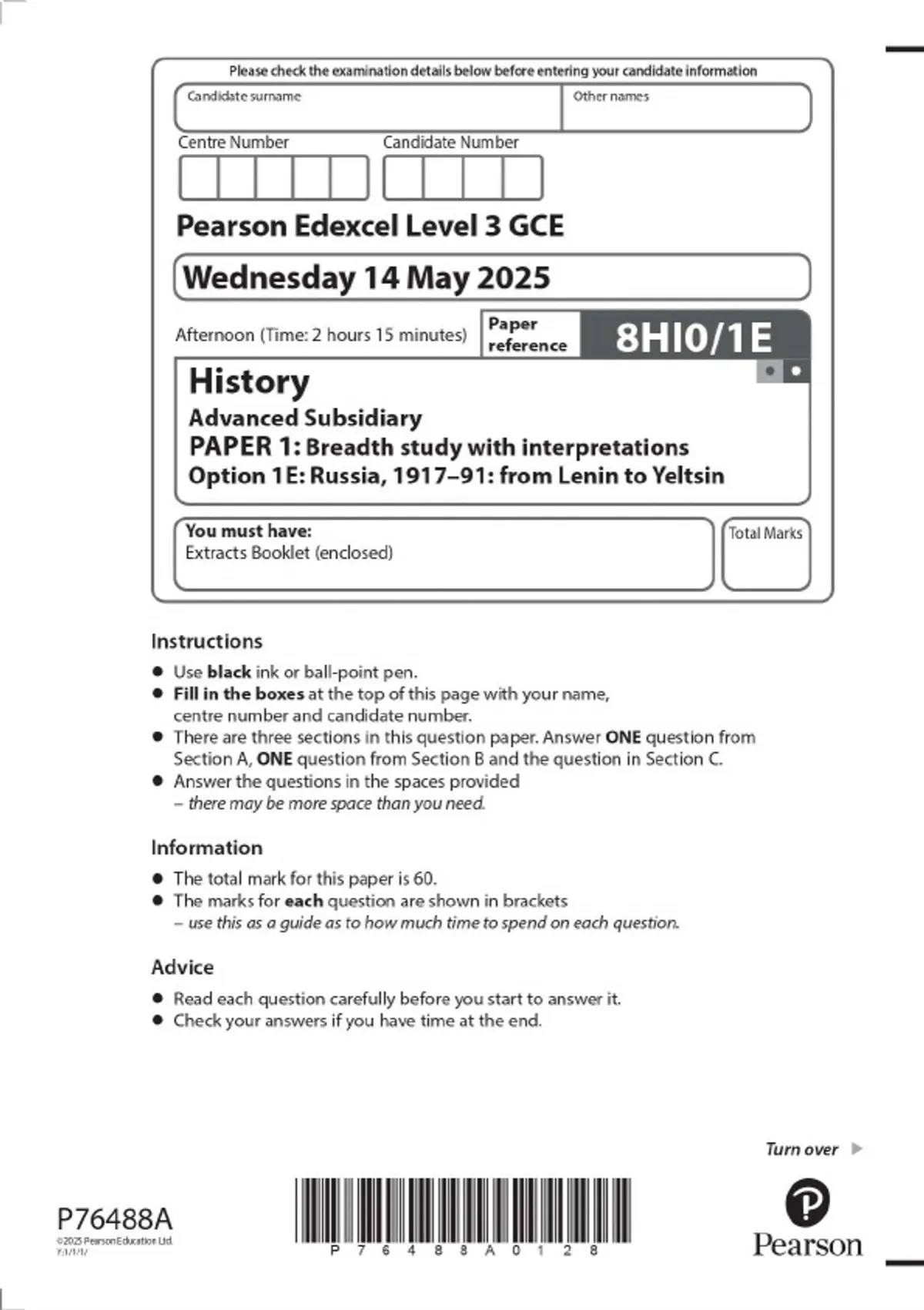 Pearson Edexcel Level 3 GCE History Advanced Subsidiary PAPER 1: Breadth study with interpretations Option 1E: Russia, 1917–91: from Lenin to Yeltsin MAY 2025 Combined Question Paper and Mark Scheme