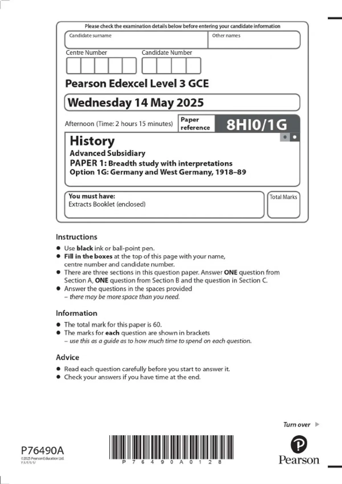 Pearson Edexcel Level 3 GCE History Advanced Subsidiary PAPER 1: Breadth study with interpretations Option 1G: Germany and West Germany, 1918–89 MAY 2025 Combined Question Paper and Mark Scheme