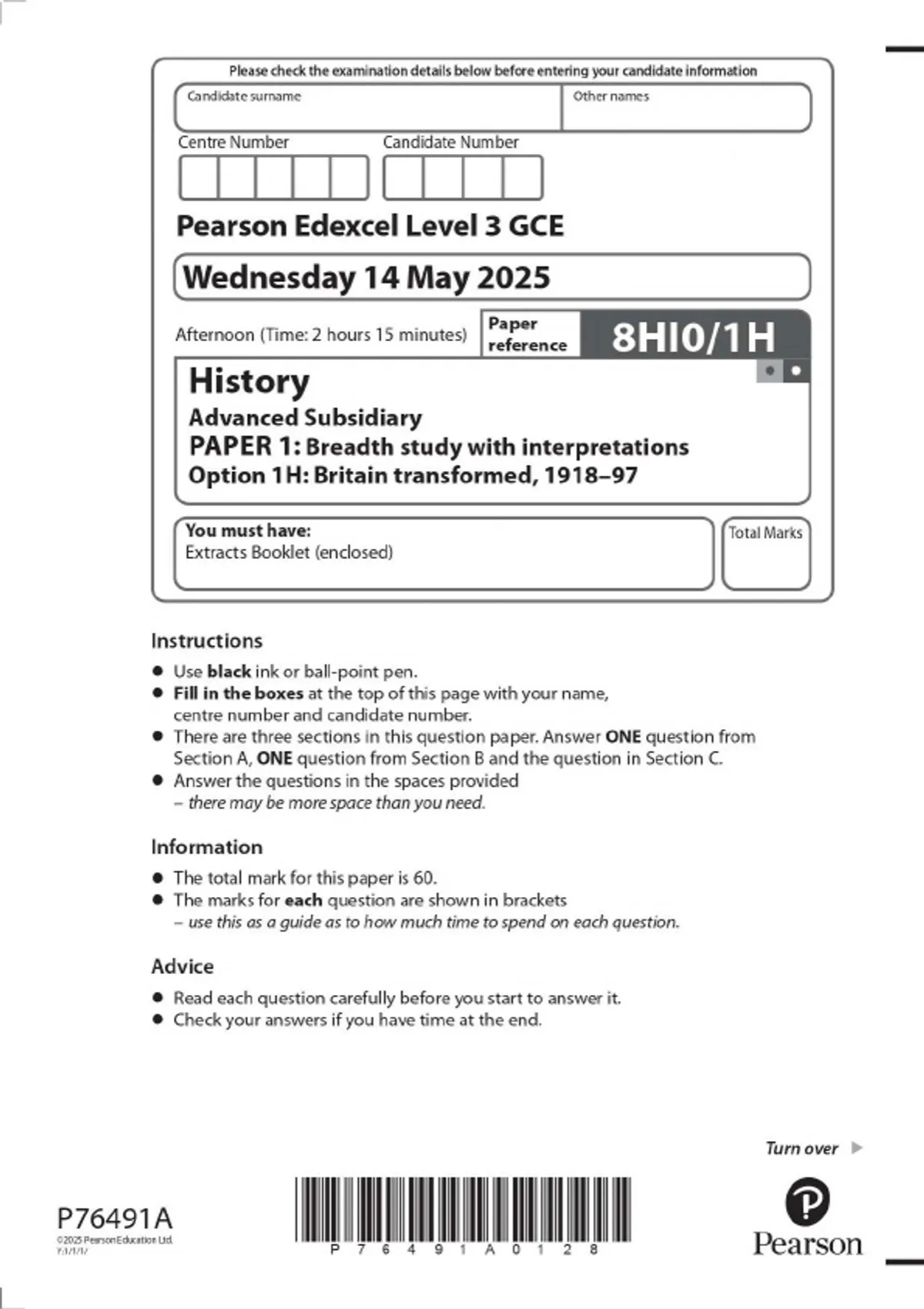 Pearson Edexcel Level 3 GCE History Advanced Subsidiary PAPER 1: Breadth study with interpretations Option 1H: Britain transformed, 1918–97 MAY 2025 Combined Question Paper and Mark Scheme