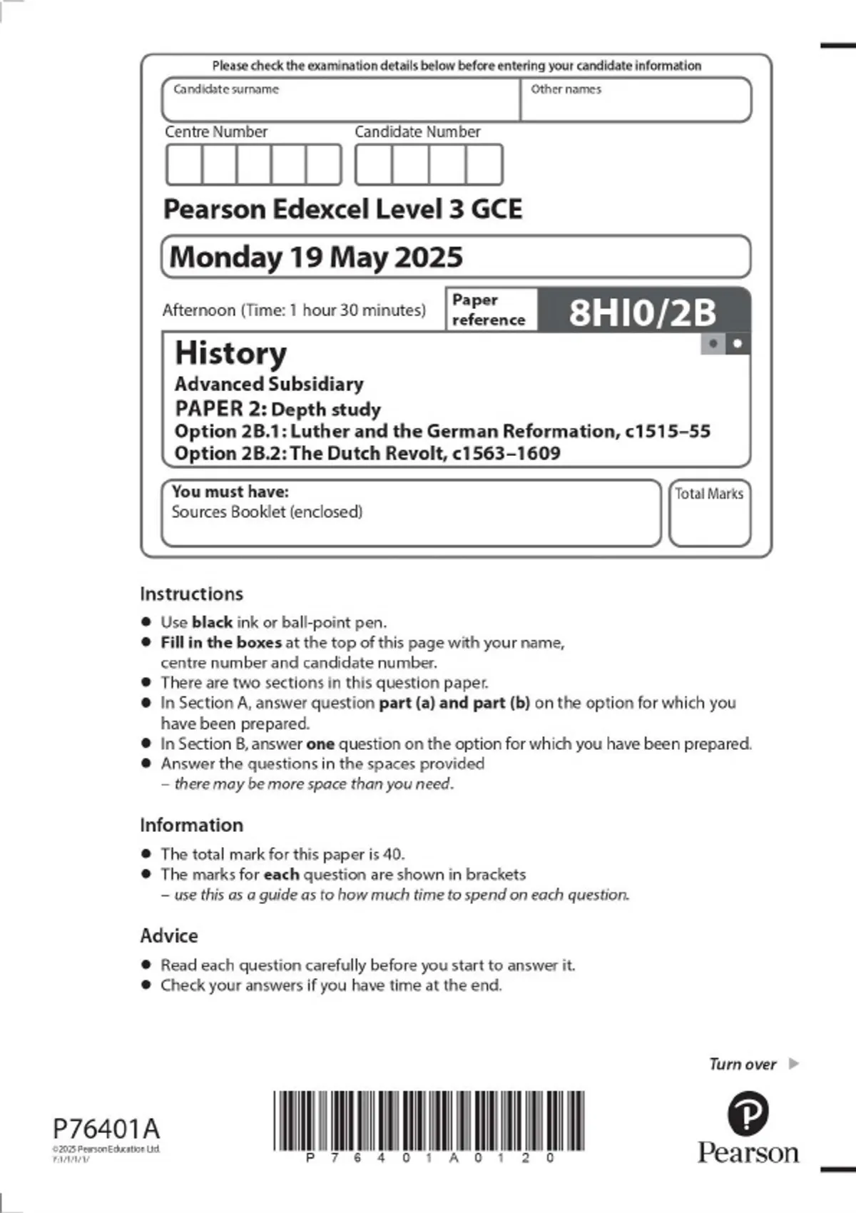 Pearson Edexcel Level 3 GCE History Advanced Subsidiary PAPER 2: Depth study Option 2B.1: Luther and the German Reformation, c1515–55 Option 2B.2: The Dutch Revolt, c1563–1609 MAY 2025 Combined Question Paper and Mark Scheme