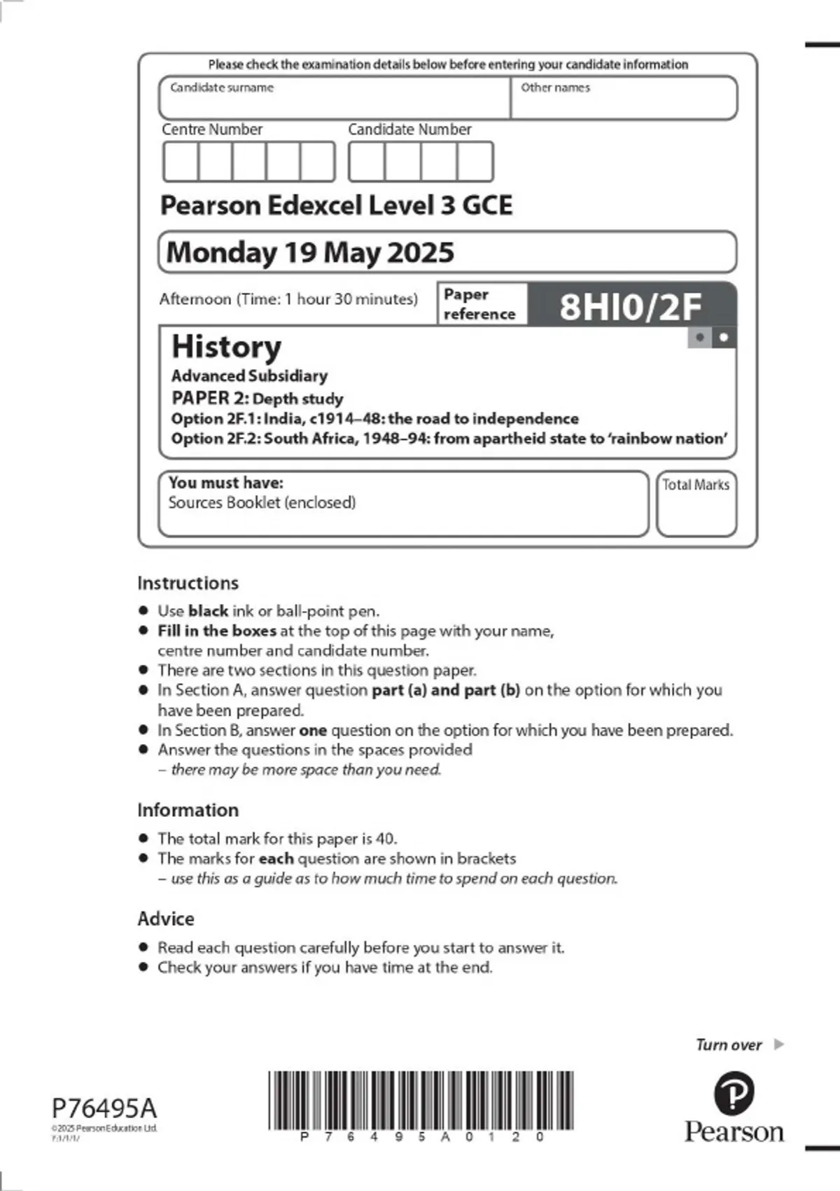 Pearson Edexcel Level 3 GCE History Advanced Subsidiary PAPER 2: Depth study Option 2F.1: India, c1914–48: the road to independence Option 2F.2: South Africa, 1948–94: from apartheid state to ‘rainbow nation’ MAY 2025 Combined Question Paper and Mark Sc