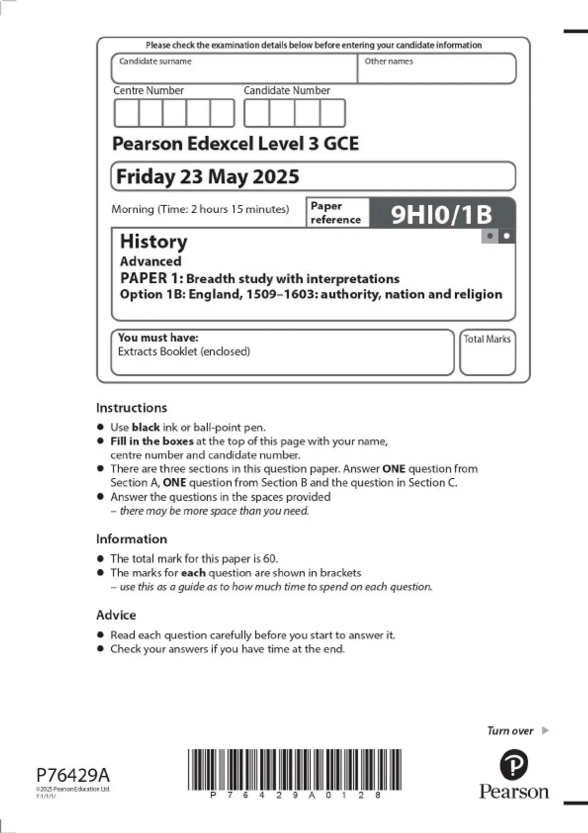 Pearson Edexcel Level 3 GCE History Advanced PAPER 1: Breadth study with interpretations Option 1B: England, 1509–1603: authority, nation and religion 2025 Combined Question Paper and Mark Scheme