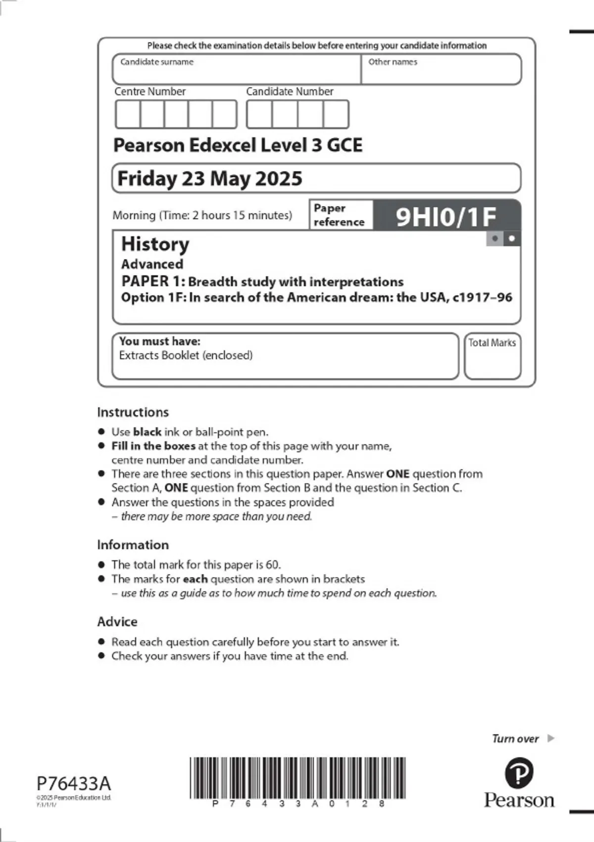 Pearson Edexcel Level 3 GCE History Advanced PAPER 1: Breadth study with interpretations Option 1F: In search of the American dream: the USA, c1917–96 MAY 2025 Combined Question Paper and Mark Scheme