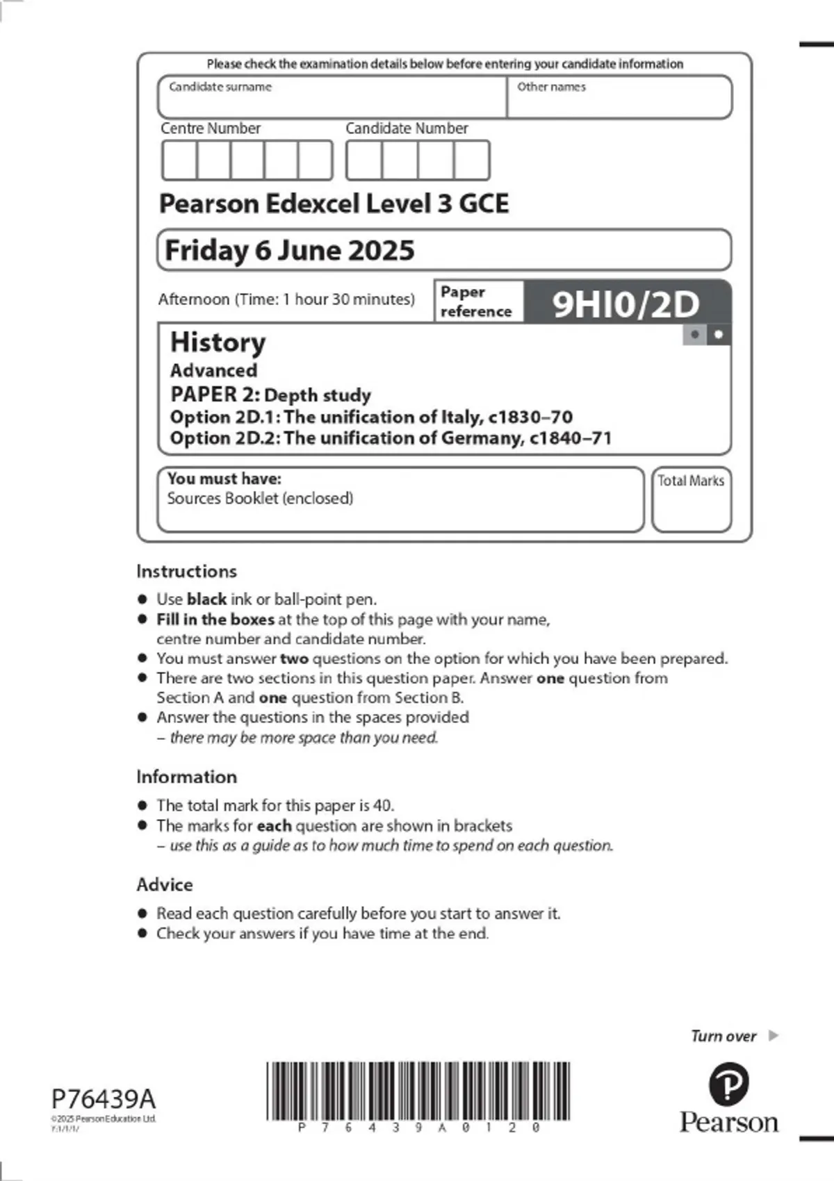 Pearson Edexcel Level 3 GCE History Advanced PAPER 2: Depth study Option 2D.1: The unification of Italy, c1830–70 Option 2D.2: The unification of Germany, c1840–71 JUNE 2025 Combined Question Paper and Mark Scheme