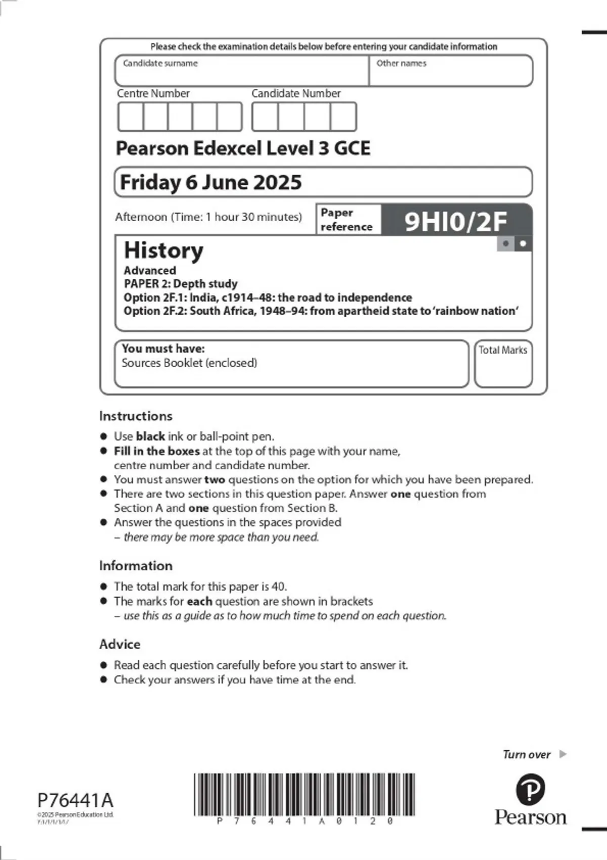 Pearson Edexcel Level 3 GCE History Advanced PAPER 2: Depth study Option 2F.1: India, c1914–48: the road to independence Option 2F.2: South Africa, 1948–94: from apartheid state to ‘rainbow nation‘JUNE 2025 Combined Question Paper and Mark Scheme